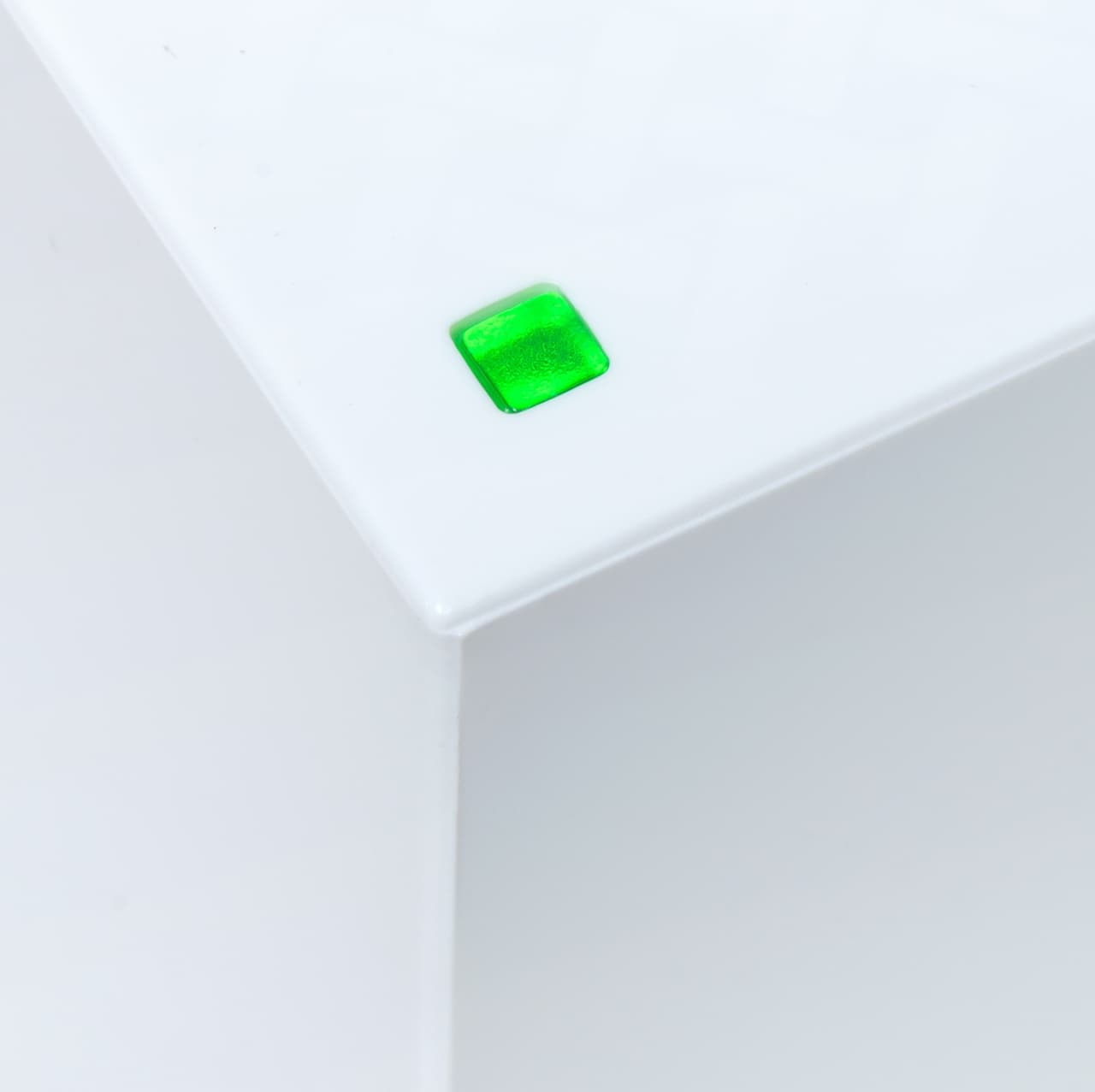 Материал — белый глянцевый пластик. Благодаря нанесенному рисунку, устройство выглядит оригинально и на нем не так заметна пыль. В одном углу на верхней панели находится многоцветный индикатор. Единственный на узле. На формально передней части разместили логотип серии.