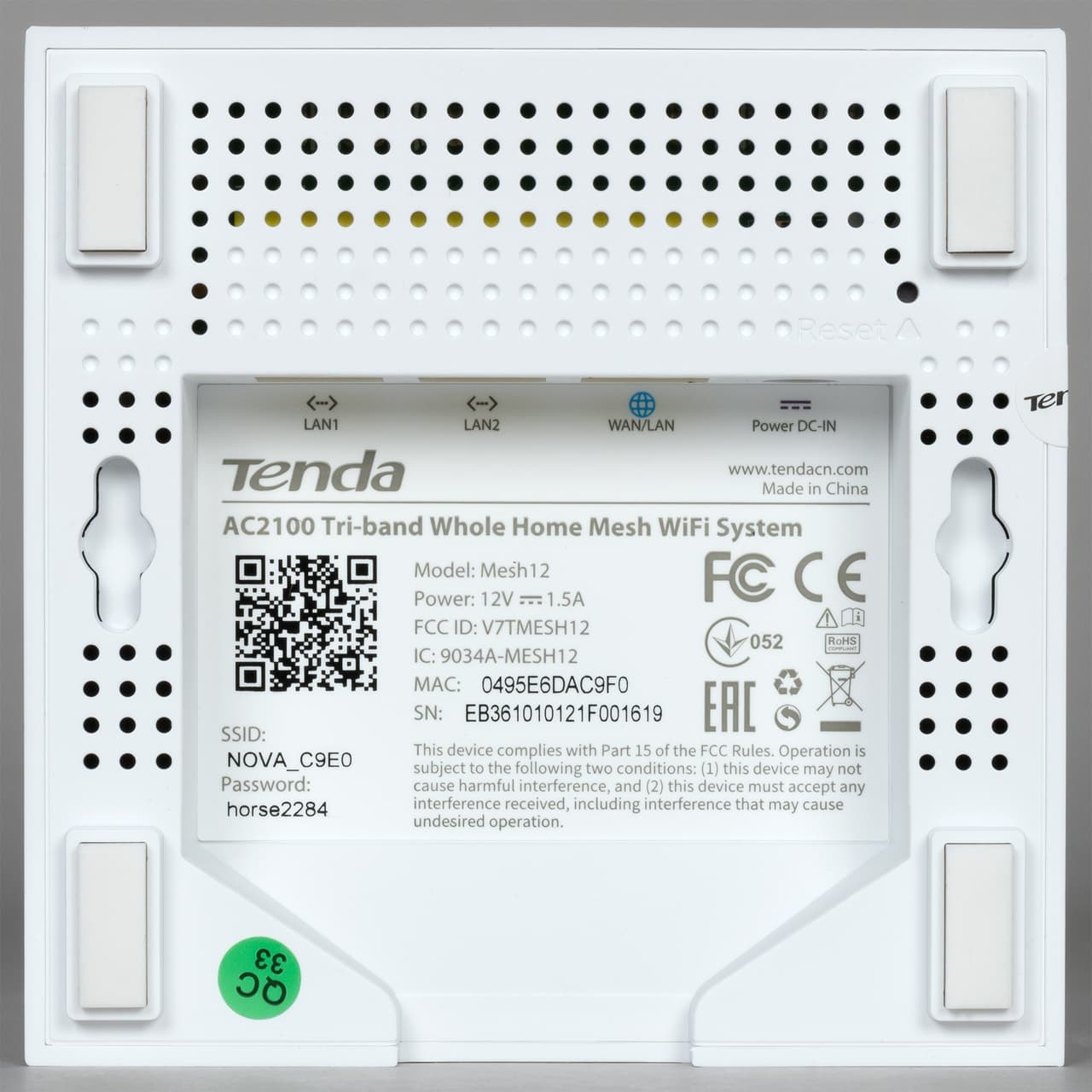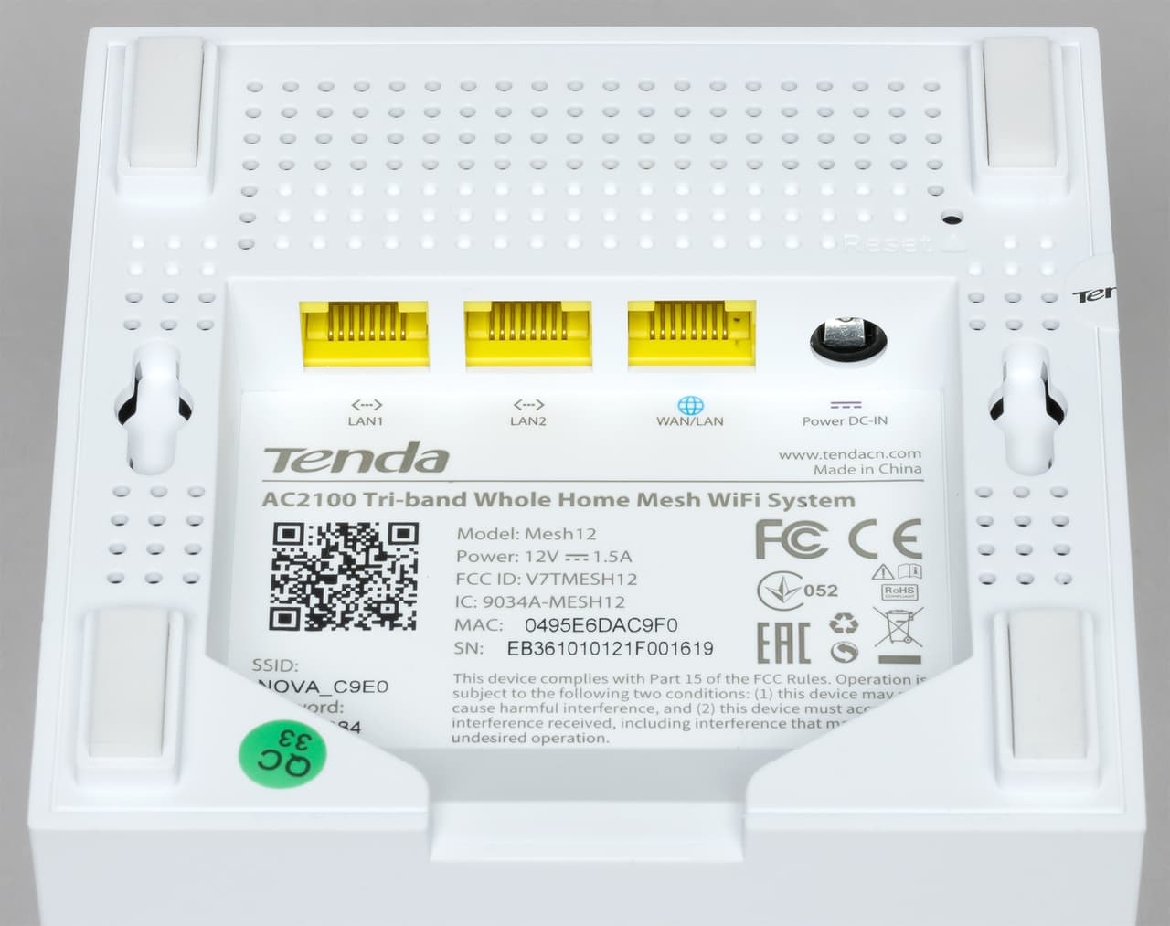 На дне мы видим решетки вентиляции, скрытую кнопку сброса, отверстия для настенного крепления, нишу с сетевыми портами (один WAN и два LAN) и входом питания. Также в центре находится информационная наклейка с индивидуальными данными (MAC-адрес, серийный номер, имя и пароль беспроводной сети).