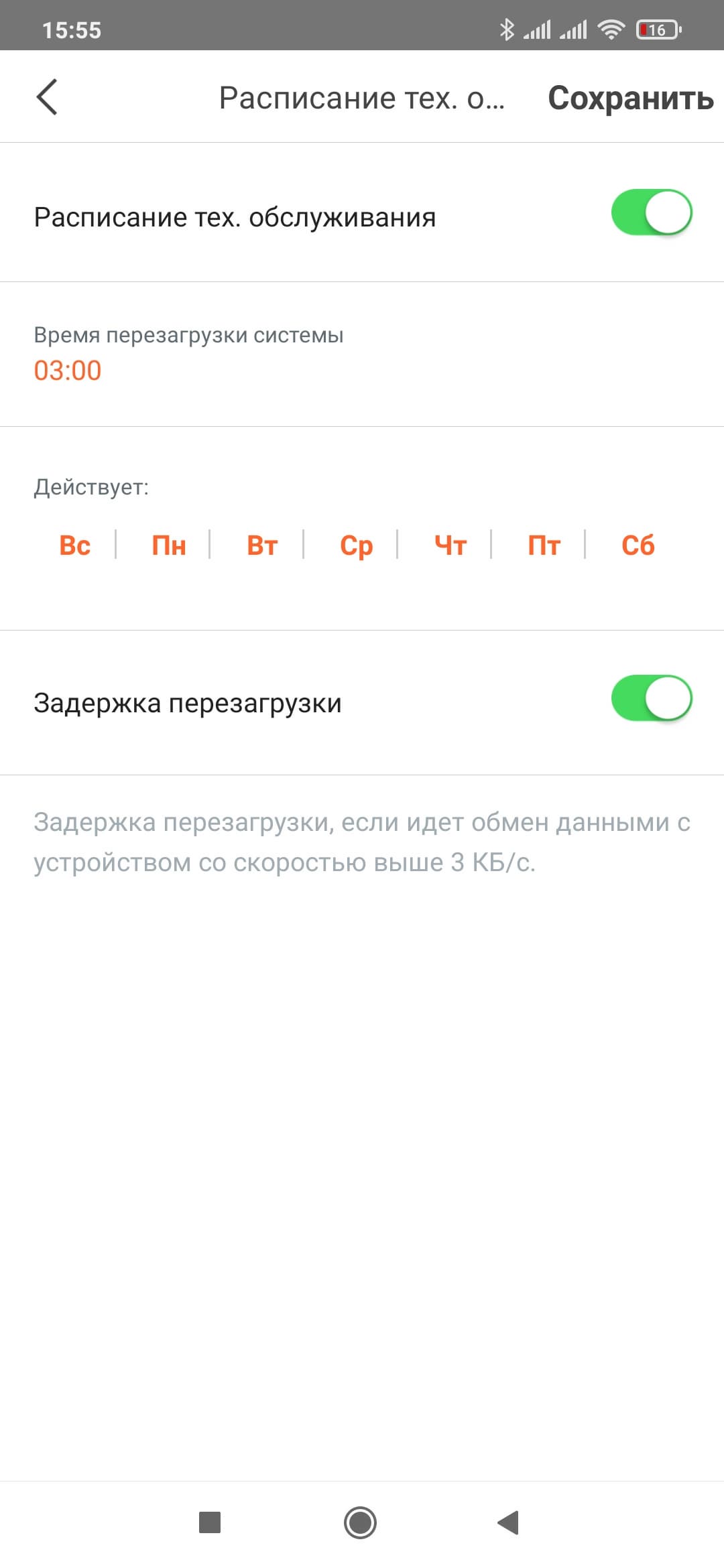 Обновление прошивки на всех узлах системы осуществляется на одноименной странице. Здесь будут указаны все участники Mesh-сети и версии их прошивок. Процесс обновления происходит с загрузкой образа через интернет и занимает около пяти минут. В течение этого времени в программе ничего делать нельзя, но сеть работать продолжает. В заводских настройках настроена перезагрузка системы в три часа ночи каждый день. Расписание можно поменять или отменить совсем. При этом перезагрузка будет отложена, если через основной узел будет идти активный обмен данными.