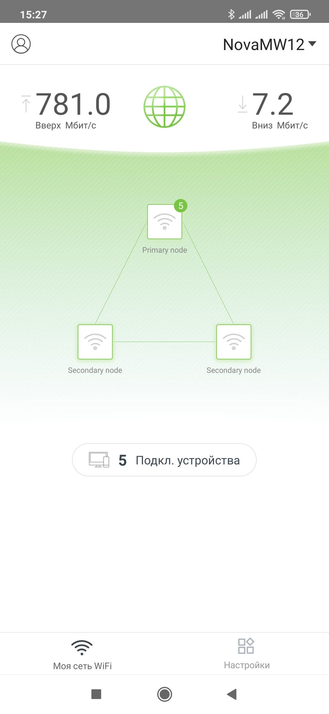 Далее на экране мы видим статус текущего подключения к интернету, скорости загрузки и передачи. На основном поле разместили все узлы со значками числа подключенных к каждому клиентов. По поводу схемы подключений узлов между собой не очень понятно, насколько она отражает действительное положение дел.
