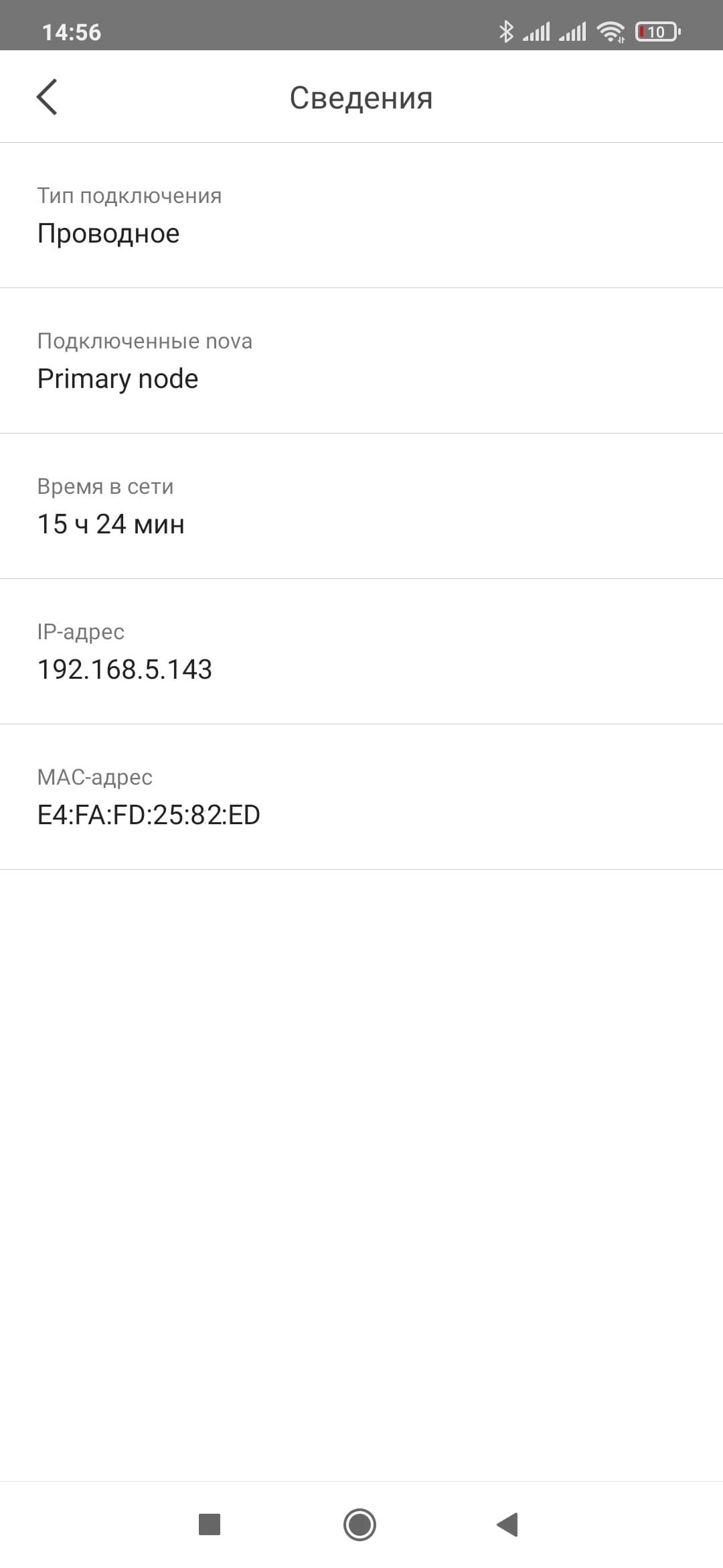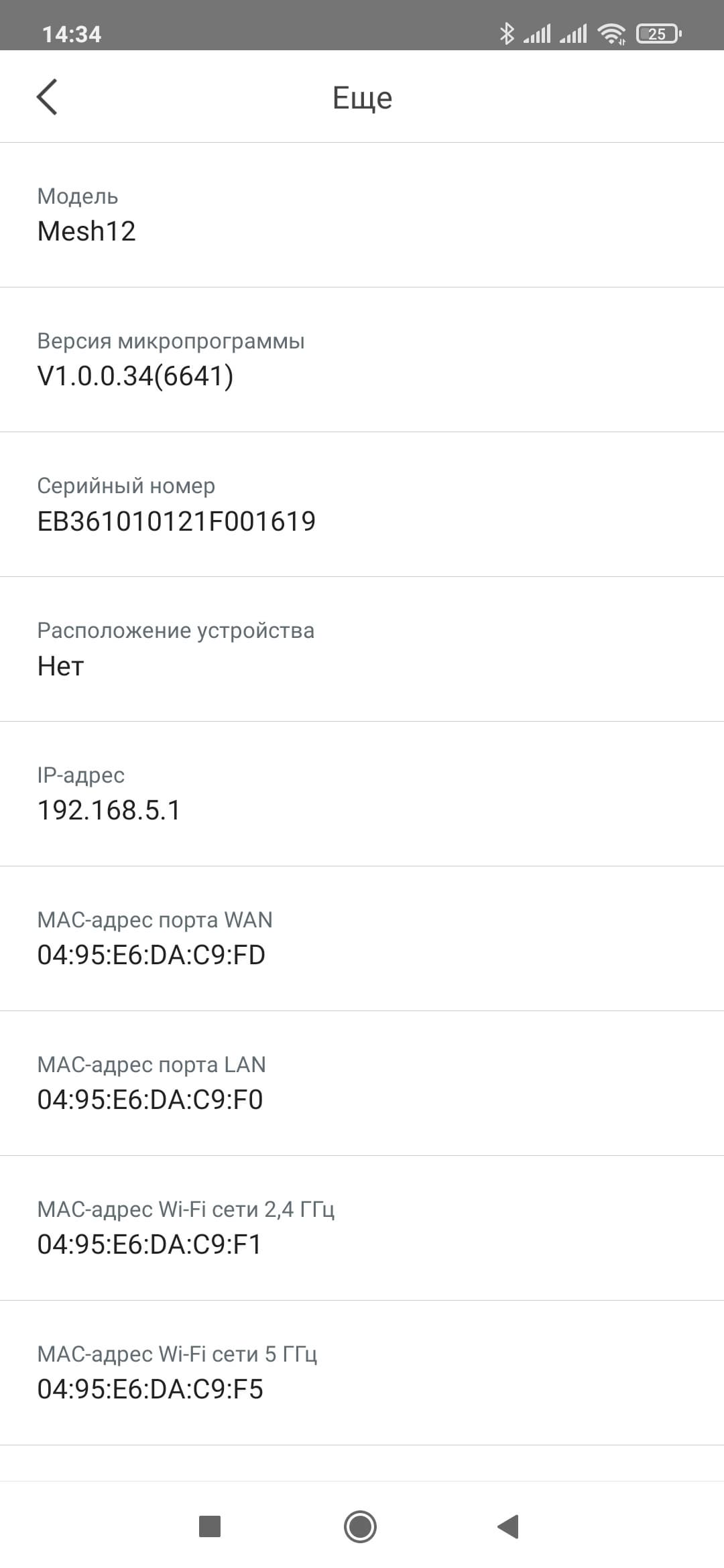 При клике на узле можно посмотреть данные по нему — качество подключения к Mesh-сети, серийный номер, версию прошивки, IP- и MAC-адреса. Опционально можно отключить индикатор и выбрать комнату/помещение, где стоит узел.