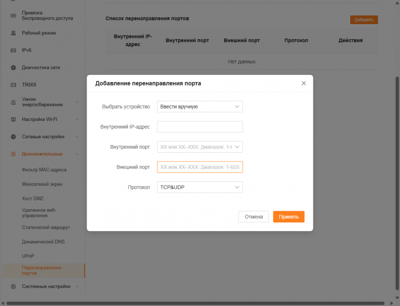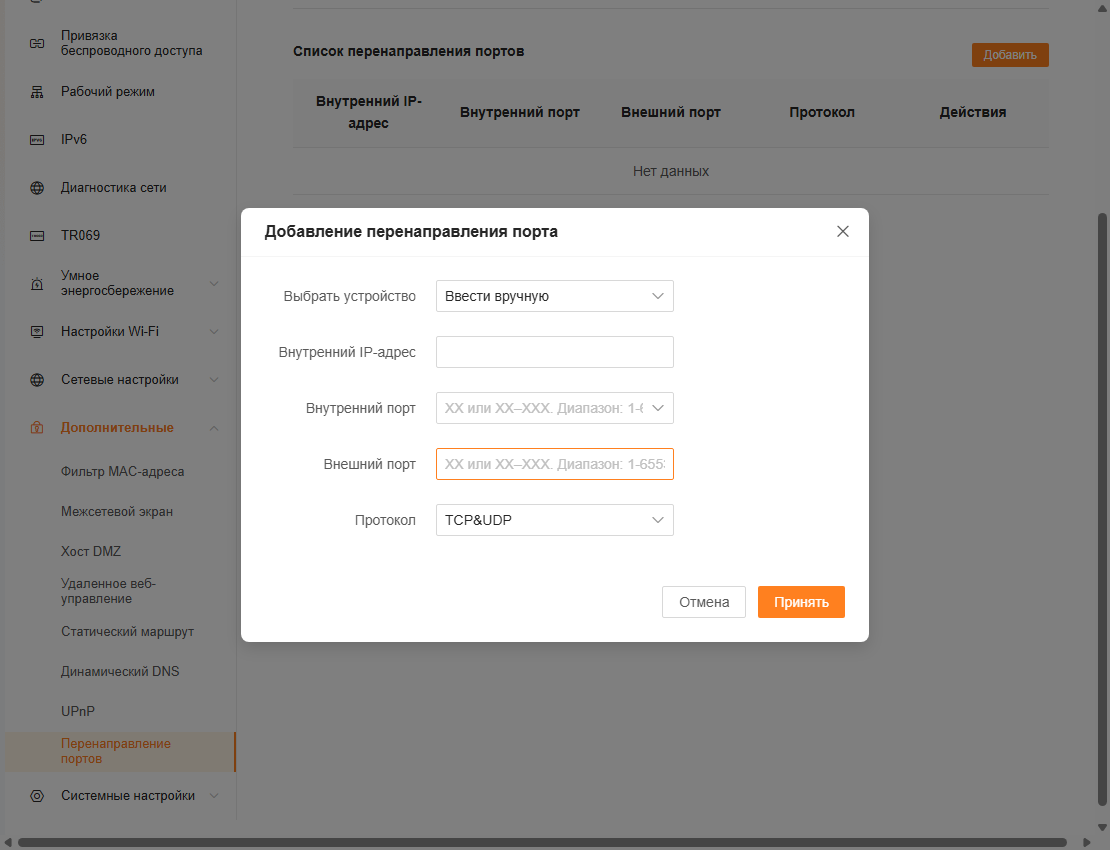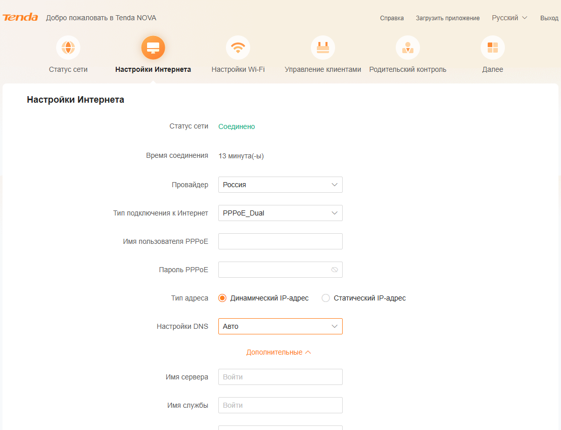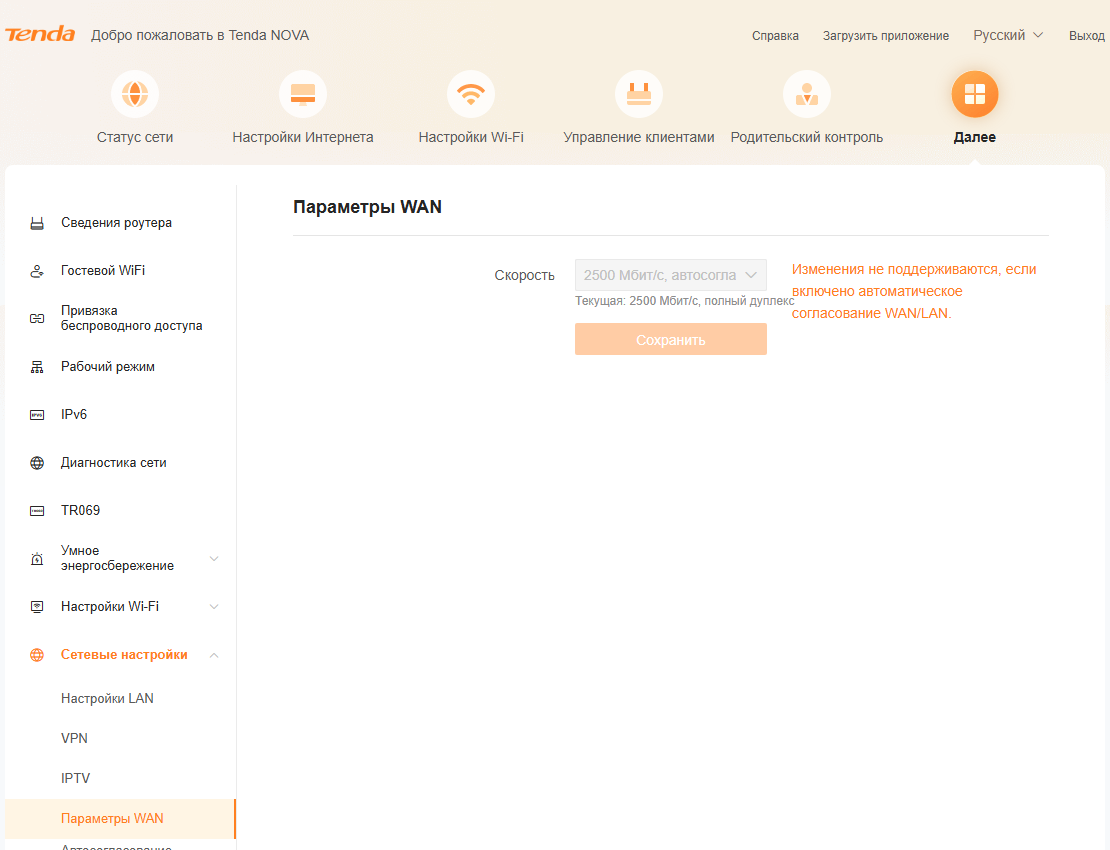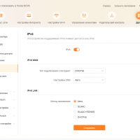 «Настройки интернета» позволяют выбрать требуемые оператором данные. Поддерживаются режимы IPoE, PPPoE, PPTP и PPPoE Dual. Предусмотрена возможность изменения MAC-адреса порта WAN, а также использование VLAN. На отдельной странице можно настроить работу с протоколом IPv6. Модель поддерживает подключение ТВ-приставок с мультикаст-трансляциями или с выделением порта. Как мы говорили выше, есть возможность использовать в роли WAN-порта порт с поддержкой скорости 2,5 Гбит/с.