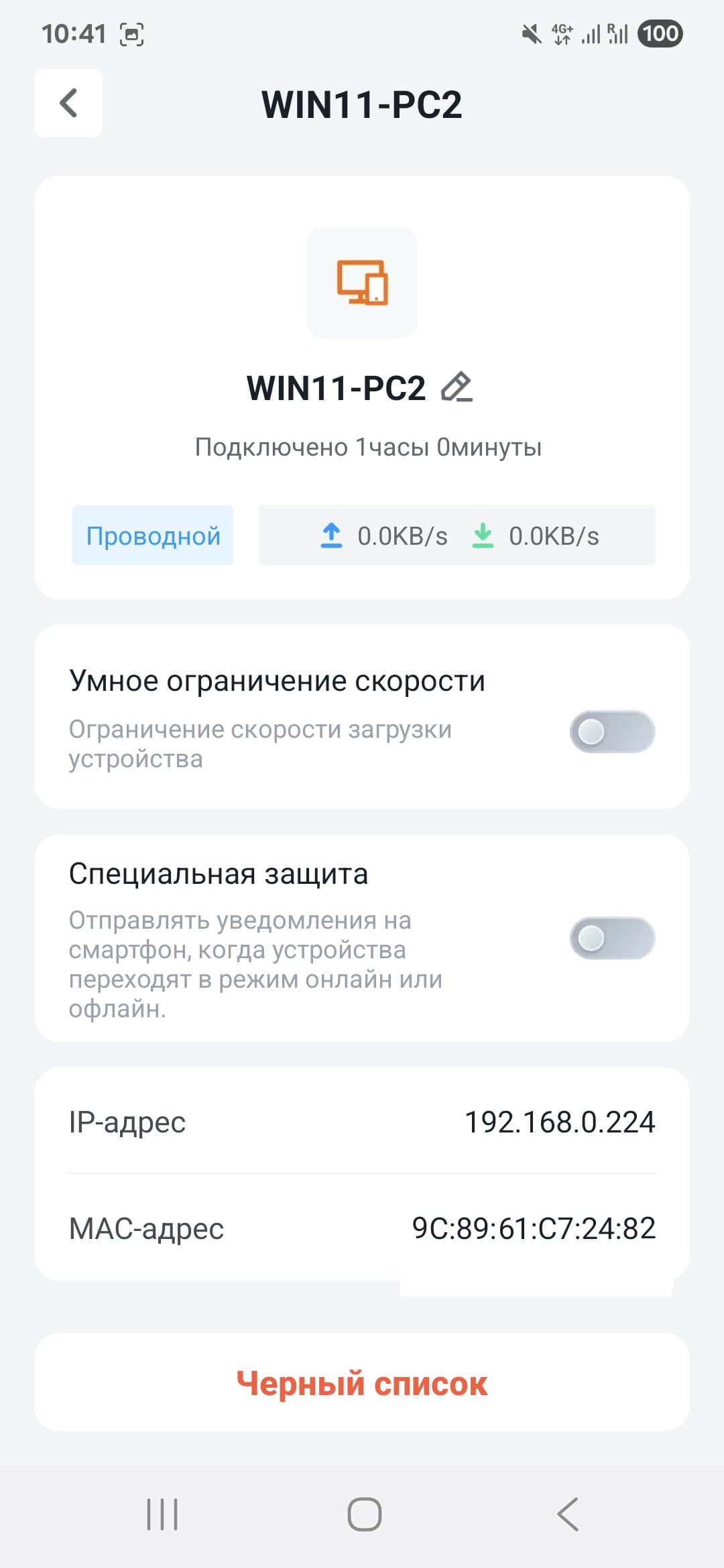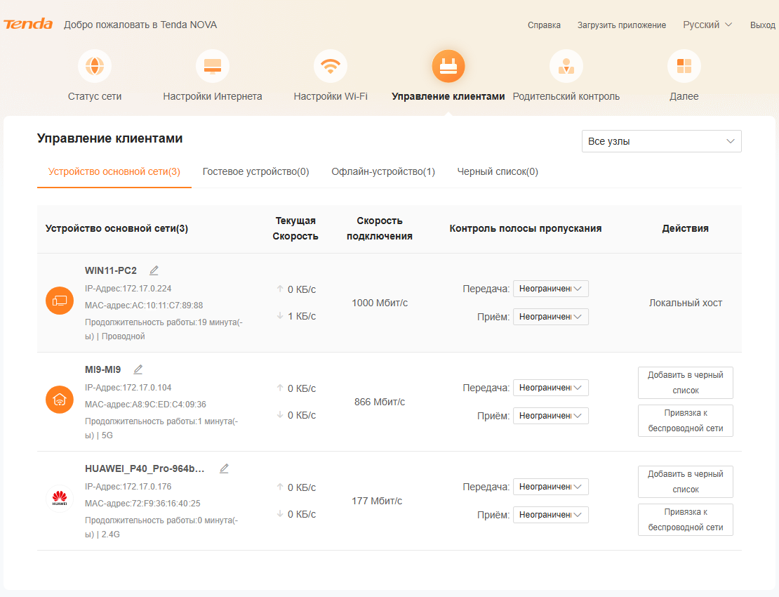Раздел «Управление клиентами» позволяет просмотреть список подключенных устройств с указанием имени, MAC, IP, скорости и длительности подключения, заблокировать им доступ или ограничить скорость. Для беспроводных клиентов есть разбивка по узлам Mesh-сети.