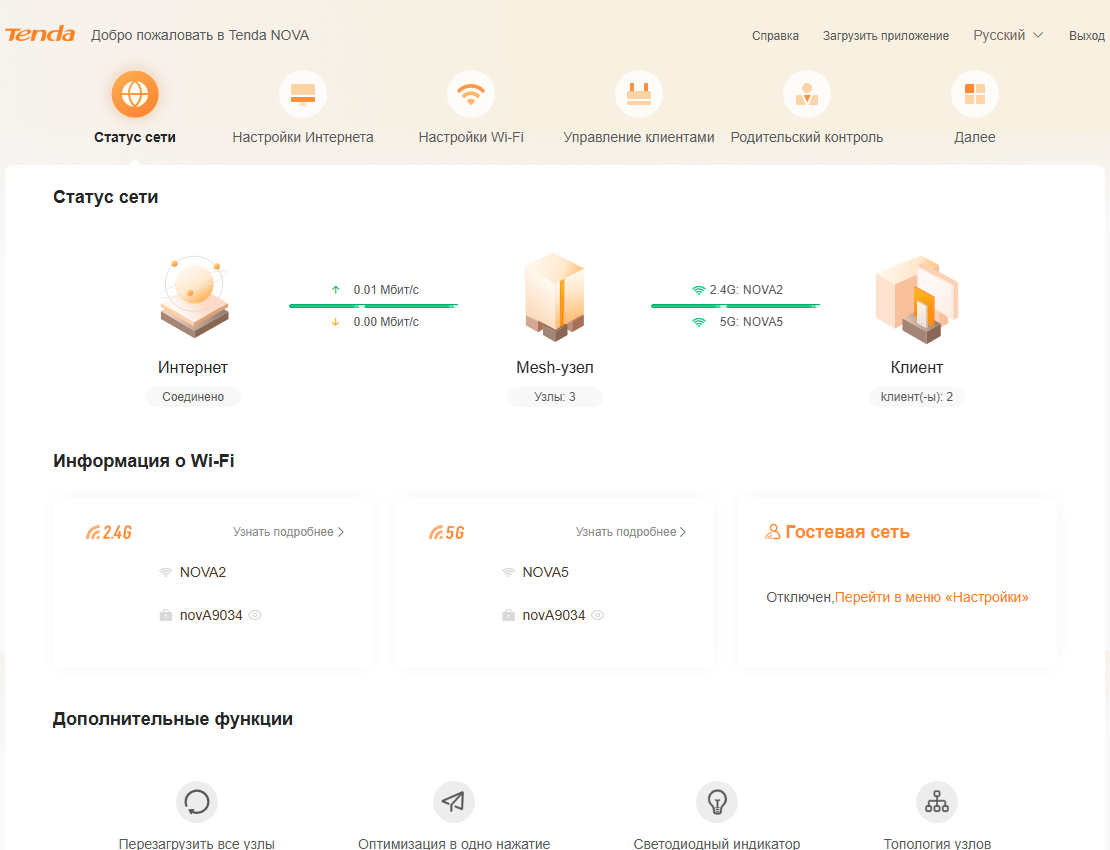 На странице «Статус сети» приводится схема текущей конфигурации и есть многочисленные ссылки на изменение соответствующих настроек, например имени и пароля Wi-Fi. В нижней части страницы можно включить отображение подключений Mesh-узлов. Жаль только, что не показываются фактические скорости их подключений (в том числе и скорости проводного порта), есть только индикатор уровня сигнала.