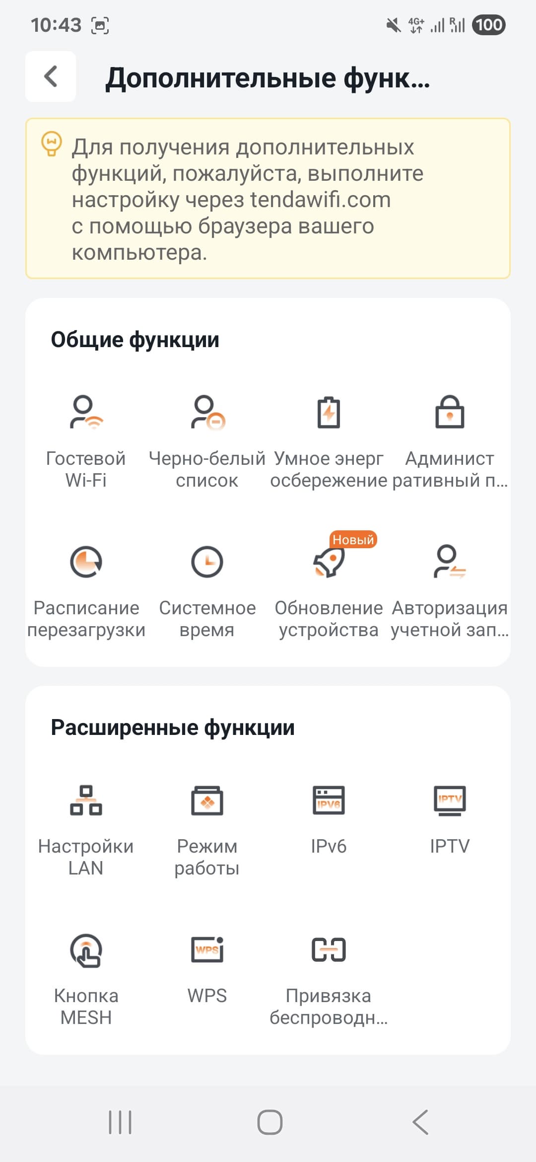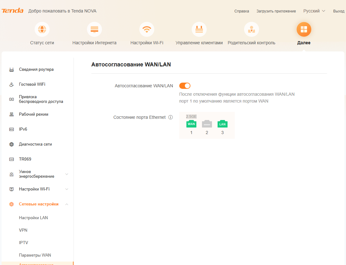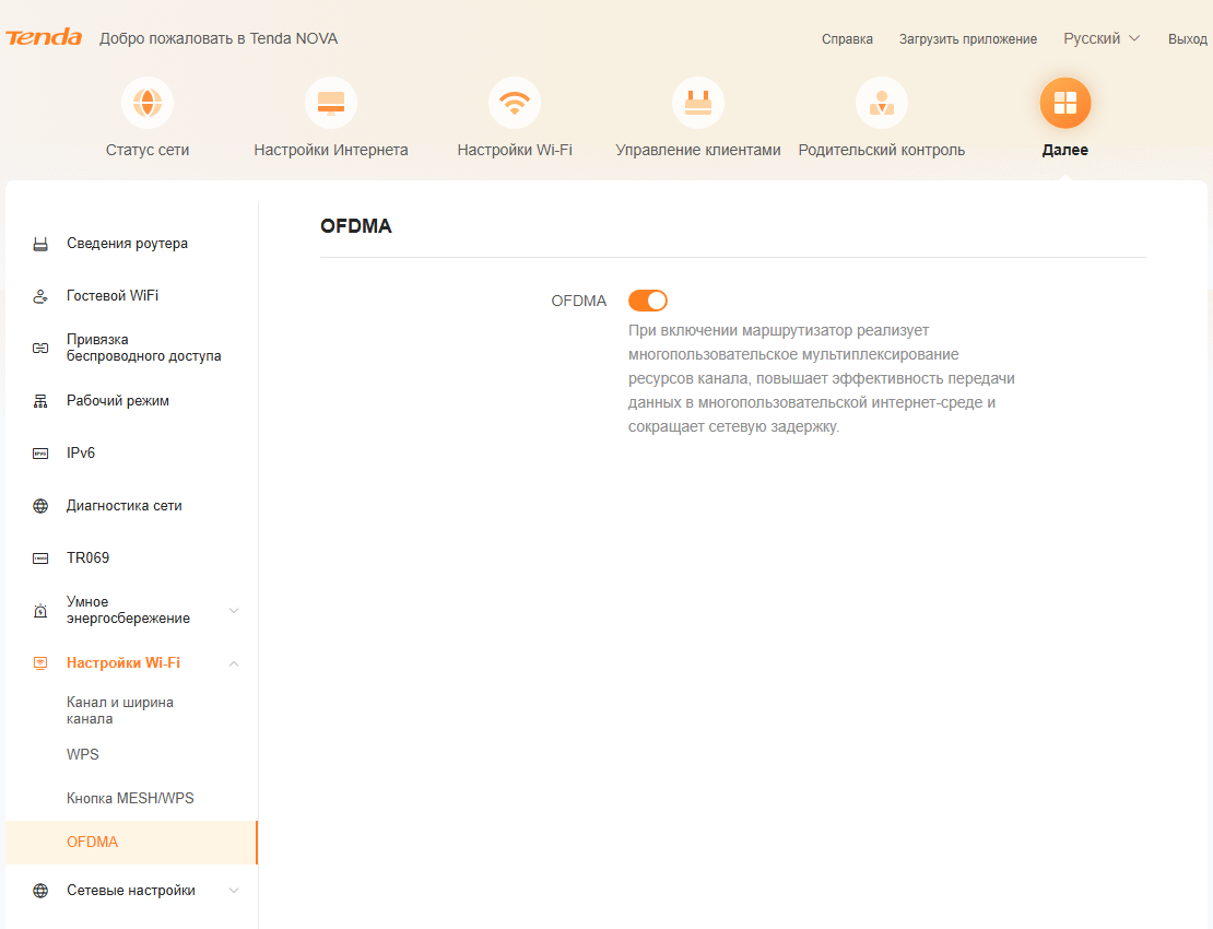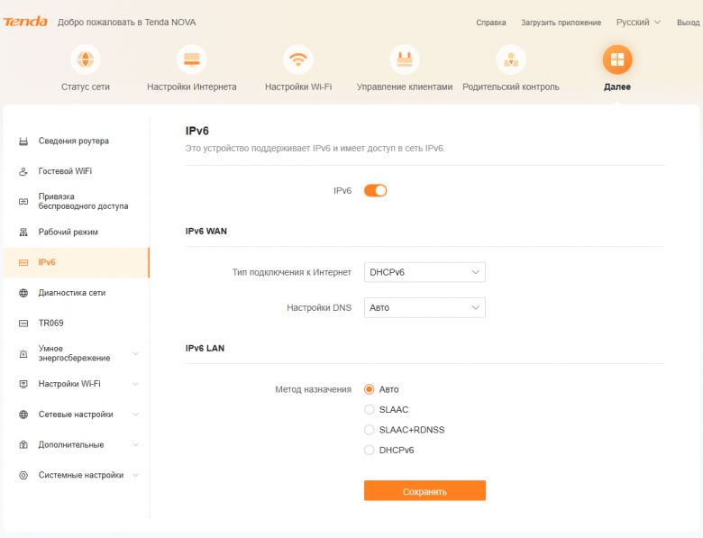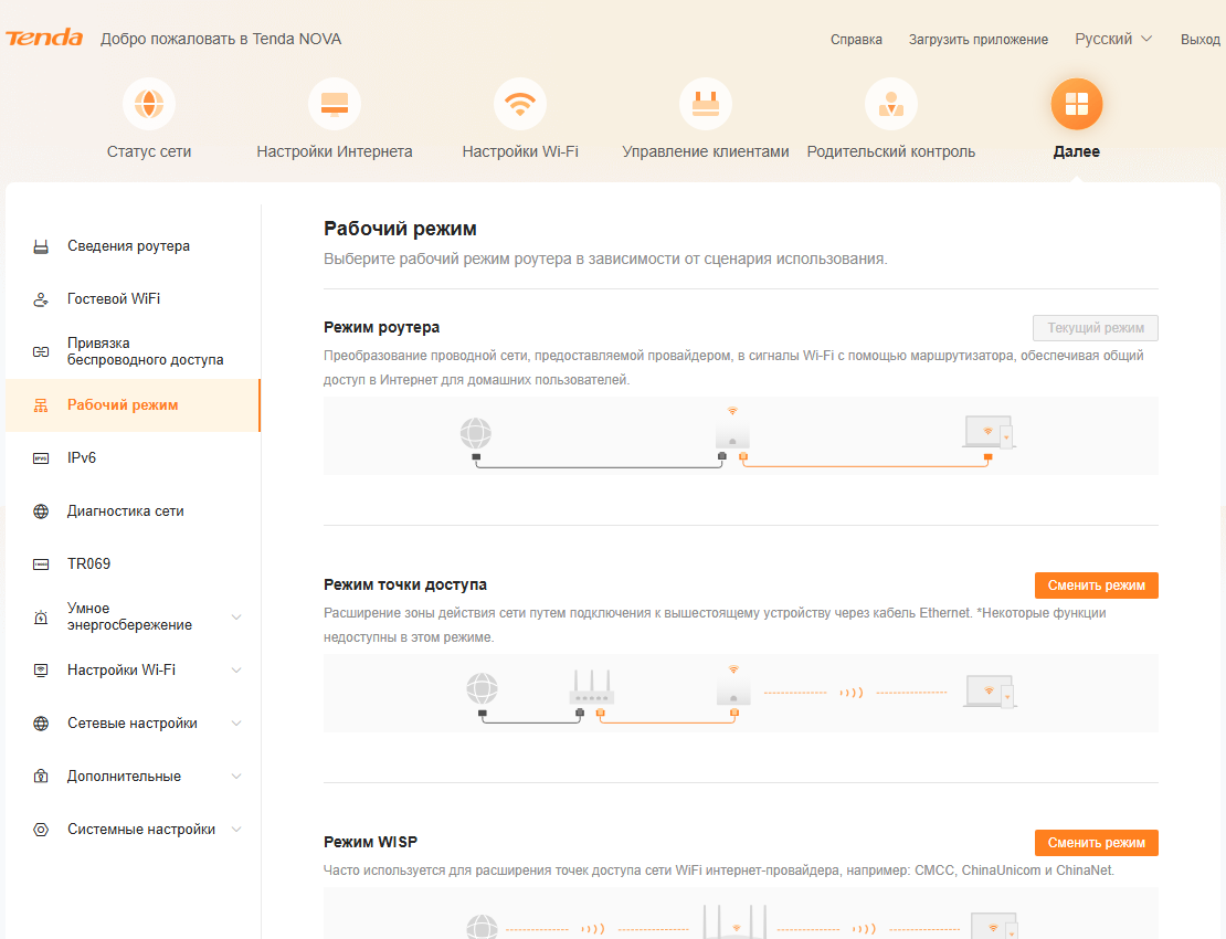 Как и большинство домашних устройств, тестируемый комплект может выступать в нескольких ролях. В данном случае можно выбрать между роутером, точкой доступа, WISP и режимом клиент + точка доступа. Это может быть полезно, если «на входе» уже используется специальный роутер, а от Tenda ME6 Pro требуется только расширить беспроводную сеть.