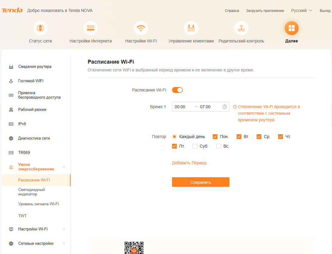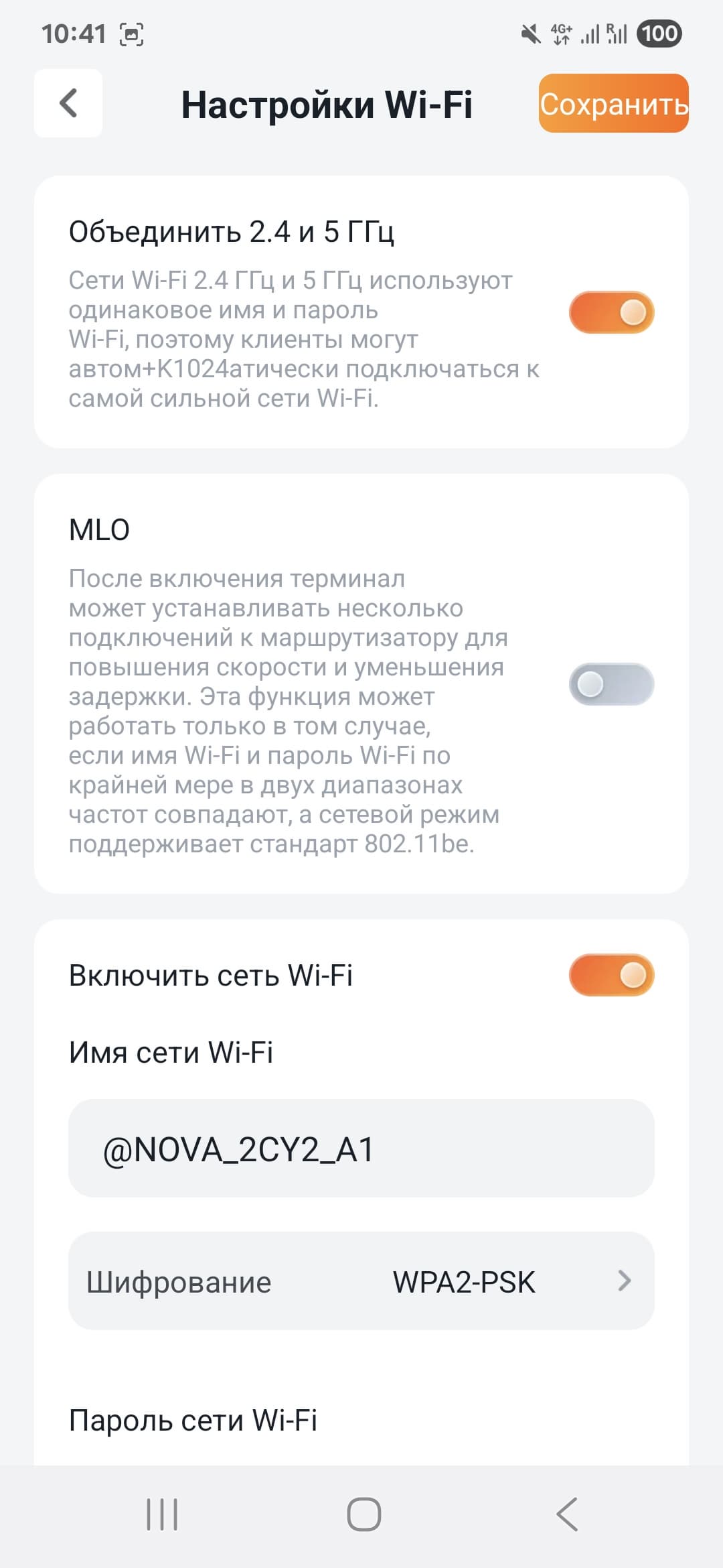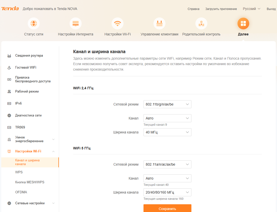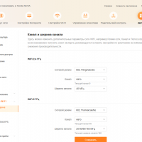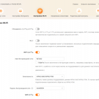 Базовые настройки Wi-Fi на одноименной странице — выбор имени сети, режима защиты и пароля. Можно использовать одинаковые или разные имена для 2,4 и 5 ГГц, есть поддержка MLO и WPA3, а также WPS. Из дополнительных функций предусмотрены выбор стандарта, канала и ширины канала, настройка расписания работы Wi-Fi, настройка выходной мощности, технологии TWT и OFDMA.