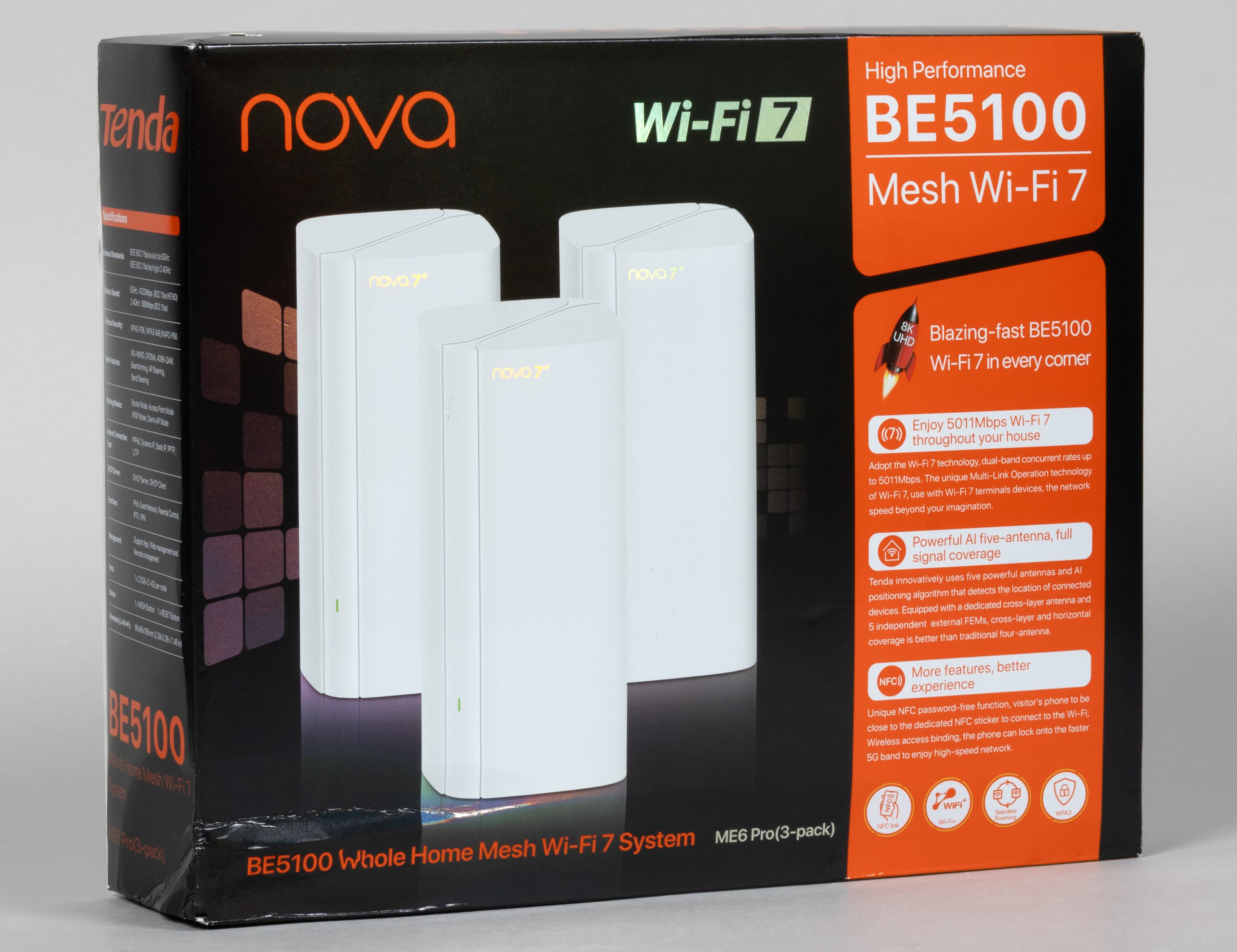 В этой статье мы познакомимся с продуктом компании Tenda — комплектом ME6 Pro, состоящим из трех узлов Nova 7. Кроме класса BE5100, продукт интересен наличием на узлах портов 2,5 Гбит/с, что помогает исключить еще одно узкое место в локальной сети. Отметим, что в тестировании использовался вариант комплекта, ориентированный на другой рынок, а на российском рынке данное решение будет представлено под названием EE6 Pro.