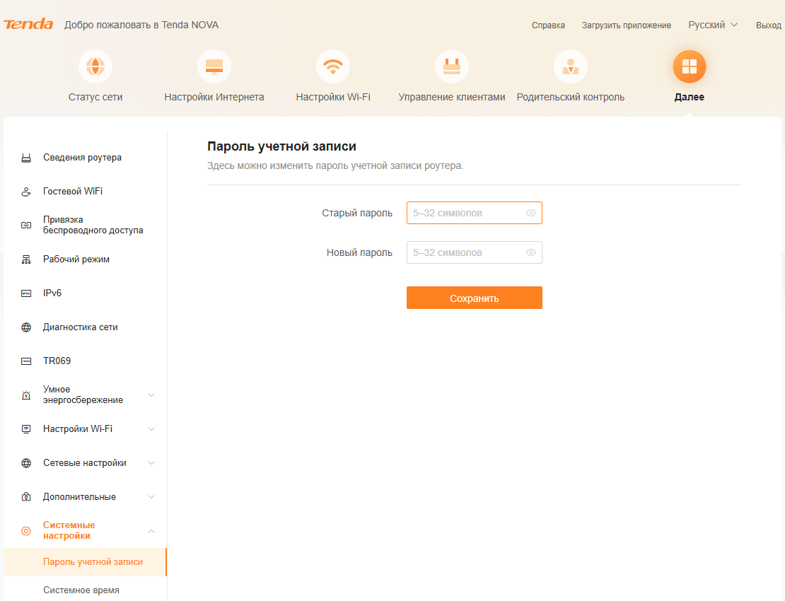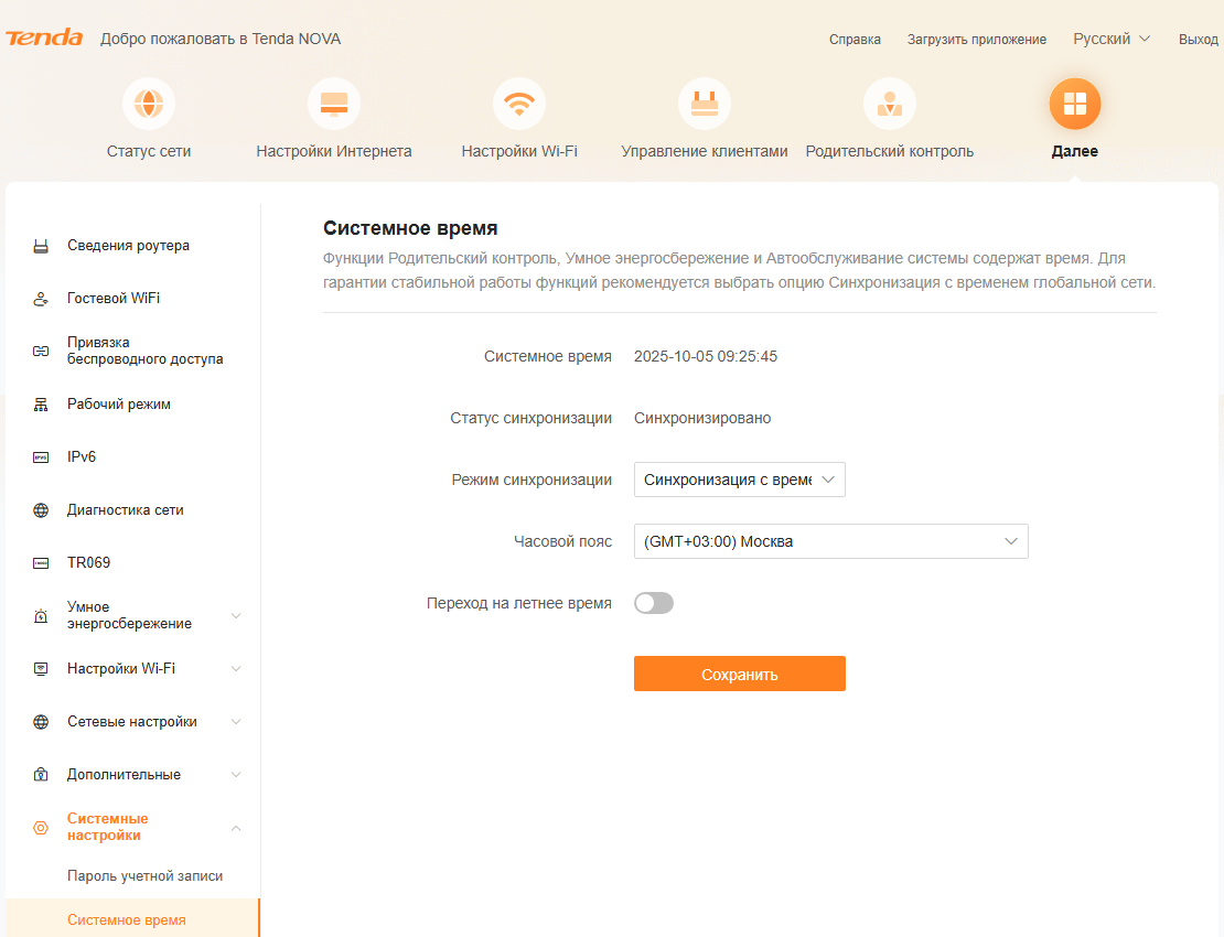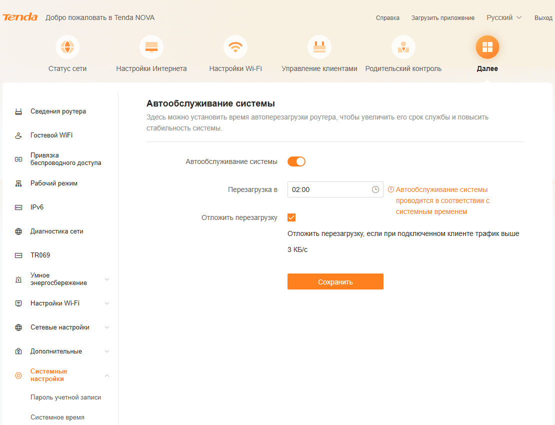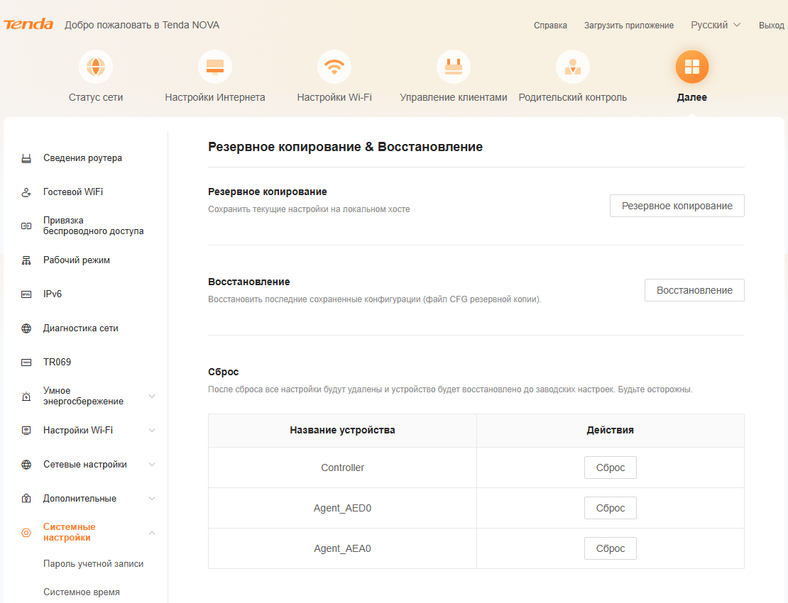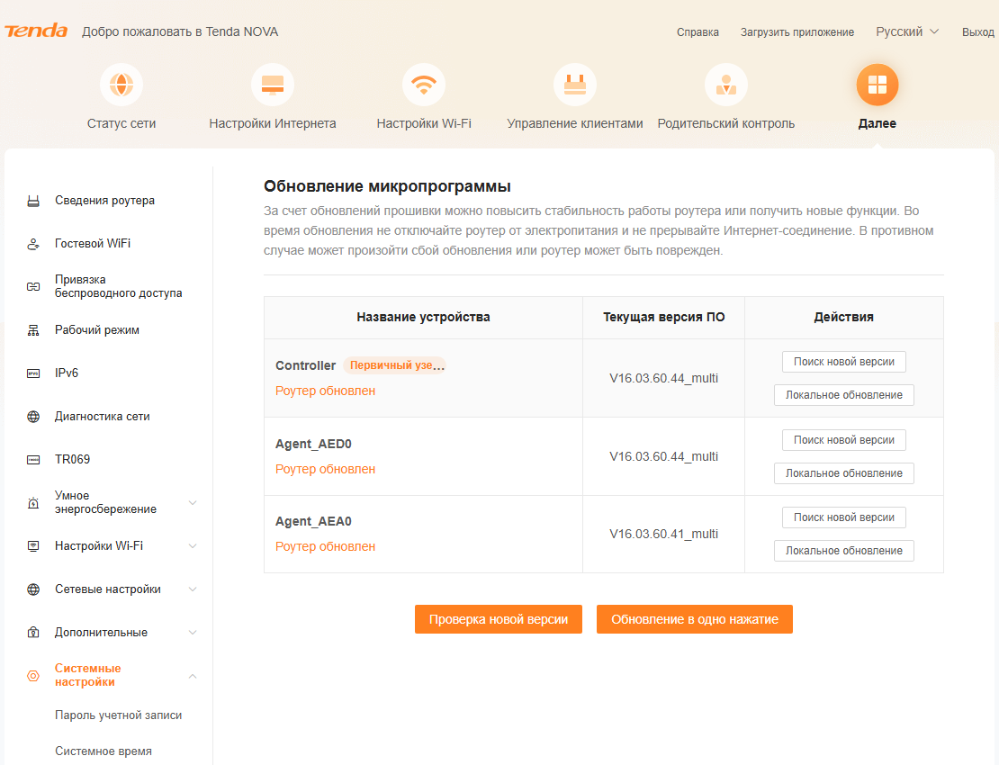 Системные настройки включают установку пароля администратора, настройку времени, обновление прошивки (в том числе и через интернет, а также можно обновить все узлы Mesh-сети), сохранение/восстановление/сброс настроек, включение расписания перезапуска, просмотр журнала событий.