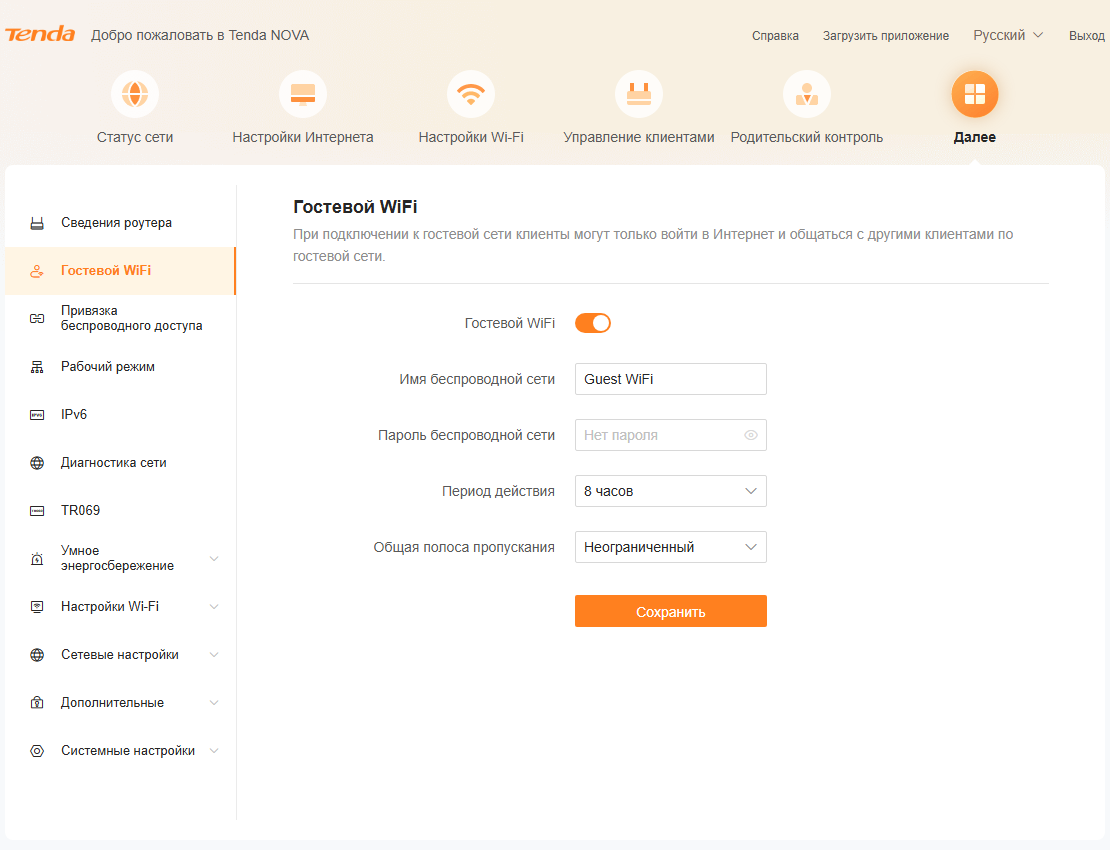 Для гостевого доступа к Wi-Fi предусмотрено создание отдельной сети (сразу на два диапазона) со своим паролем. Есть возможность выбрать длительность ее работы, а также установить ограничение скорости