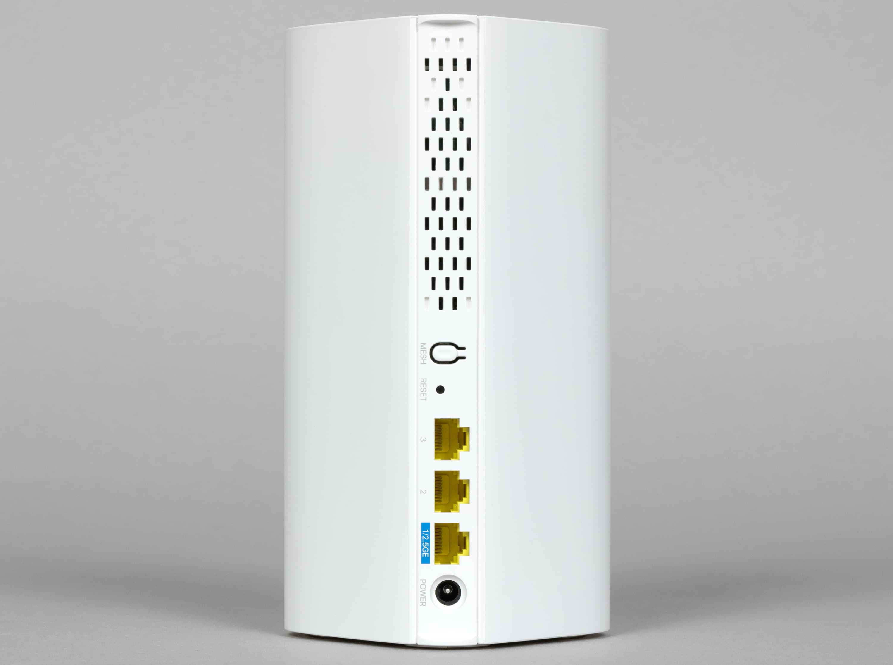 Сзади мы видим решетку вентиляции, кнопку Mesh для беспроводных подключений, скрытую кнопку сброса, два гигабитных сетевых порта, один порт на 2,5 Гбит/с и вход для блока питания.