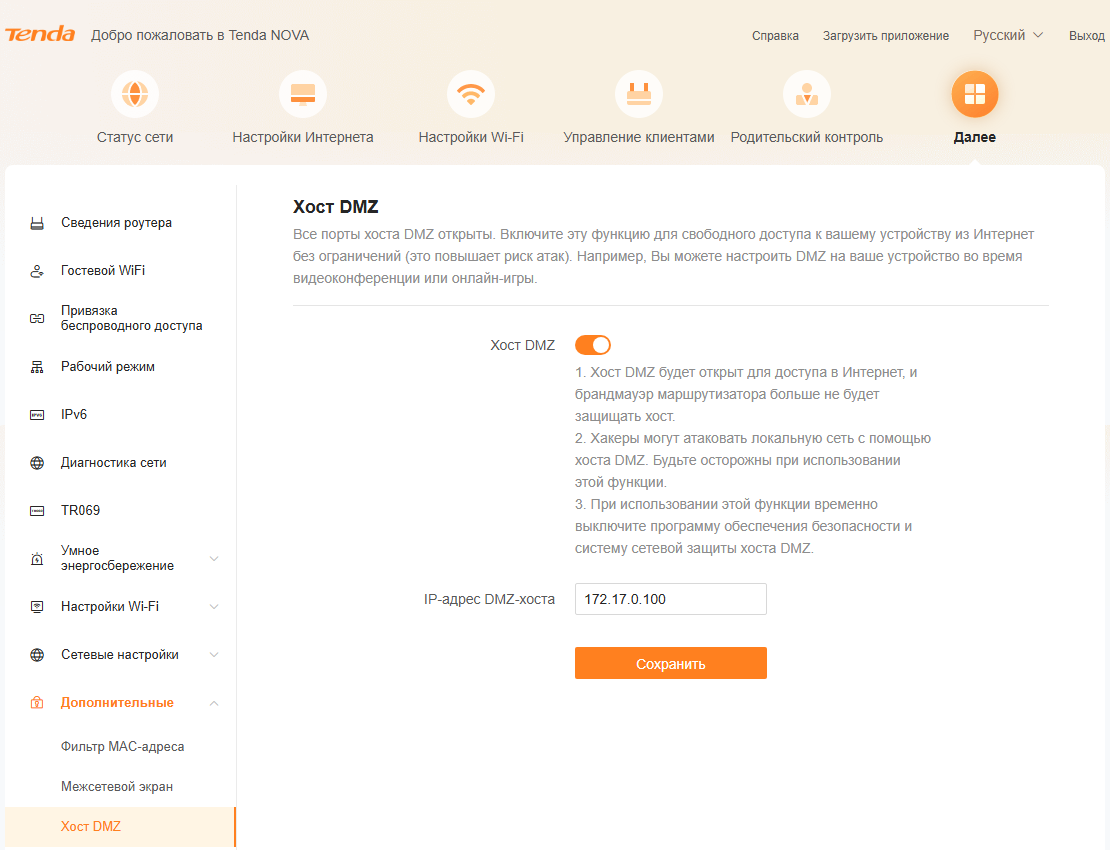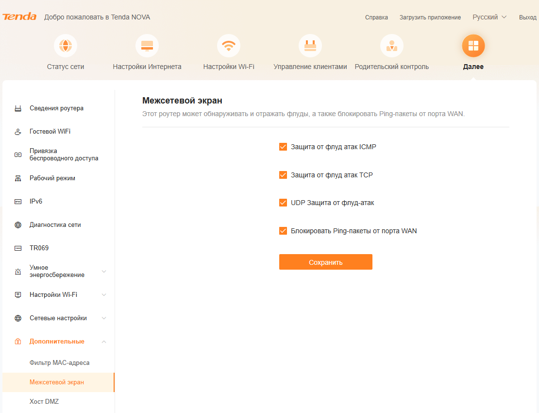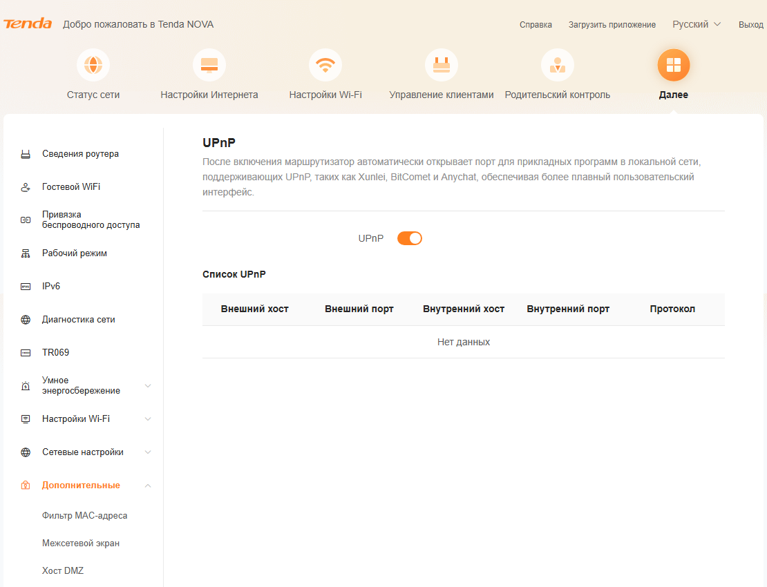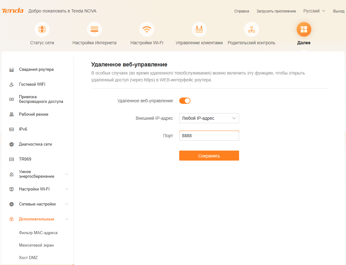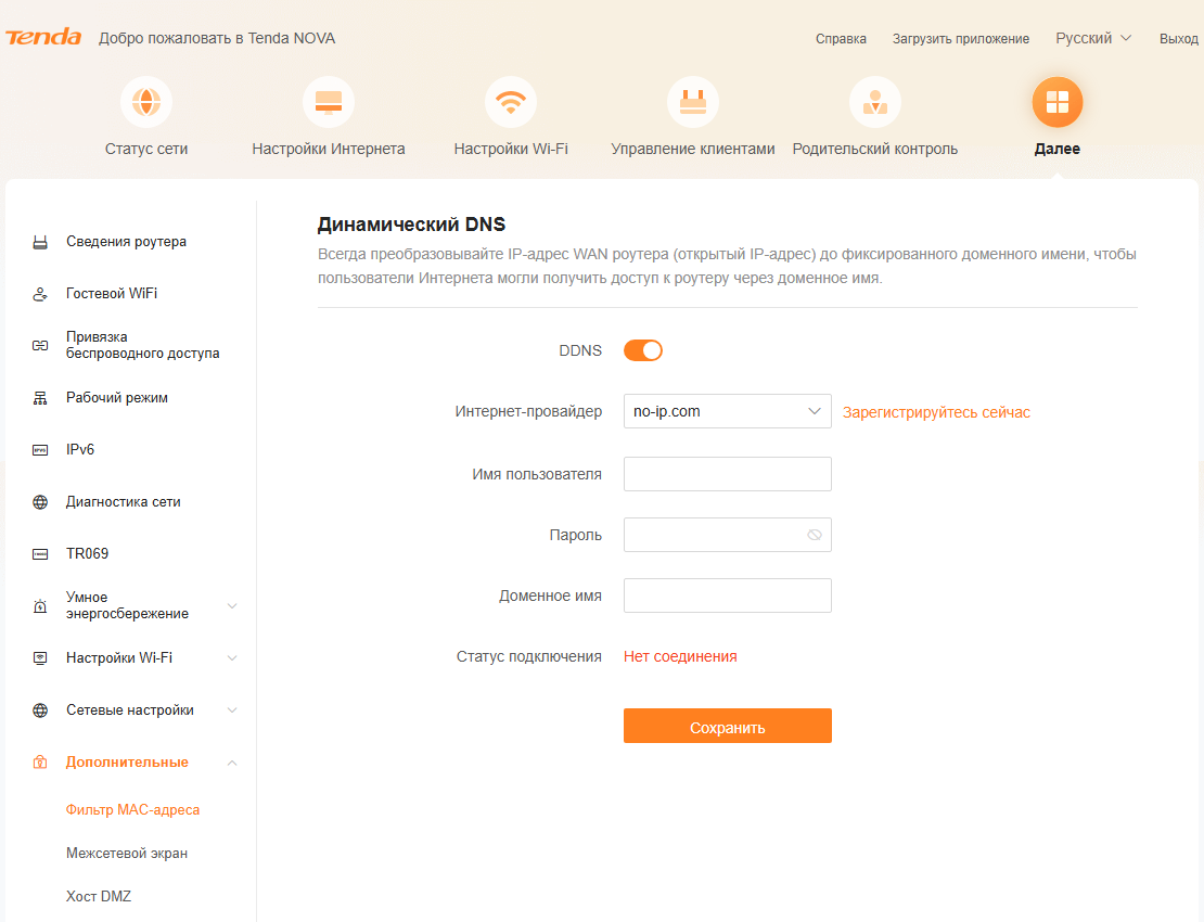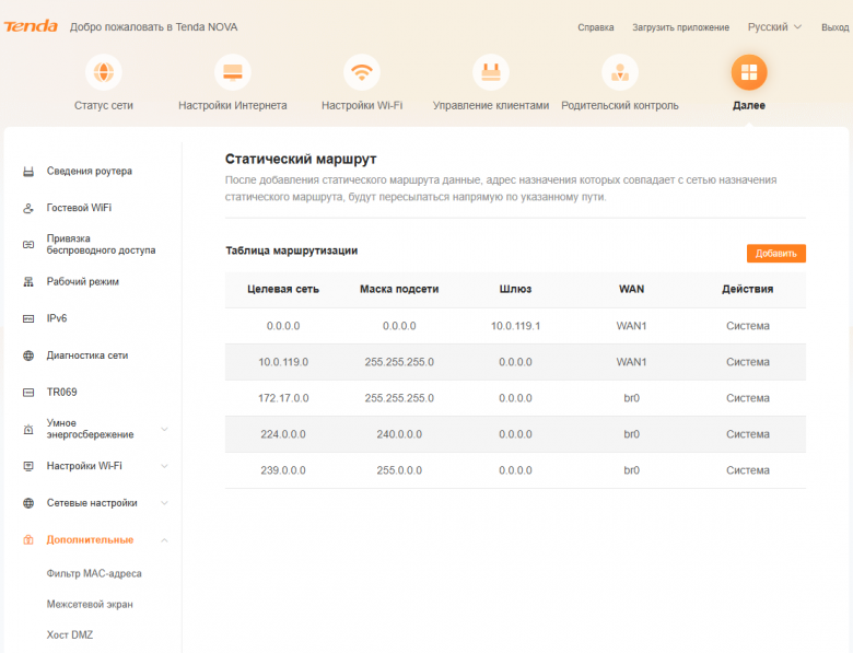 В разделе «Дополнительно» настраивается фильтр MAC-адресов, некоторые параметры встроенного межсетевого экрана, хост DMZ, трансляция портов, протокол UPnP, статические маршруты, DDNS и удаленный доступ к веб-интерфейсу (поддержки HTTPS нет).
