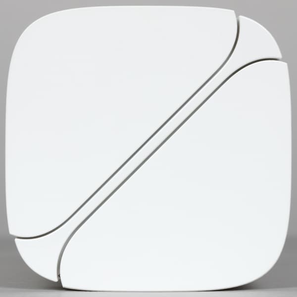 Все узлы одинаковые, они выполнены из приятного на ощупь белого матового пластика, а некоторые элементы глянцевые. Вариант установки только один — вертикально на горизонтальную поверхность. Габаритные размеры без учета подключения кабелей: высота 190 мм, квадрат 85×85 мм. Если ставить как планировал производитель, «диагональю», то будет около 100×100 мм. Глубина увеличивается примерно до 130 мм при подключении кабелей. Дизайн достаточно интересный: формально лицевая и обратная стороны находятся на скошенных ребрах корпуса, а верхняя панель разделена вставкой. Щели около последней используются для вентиляции.