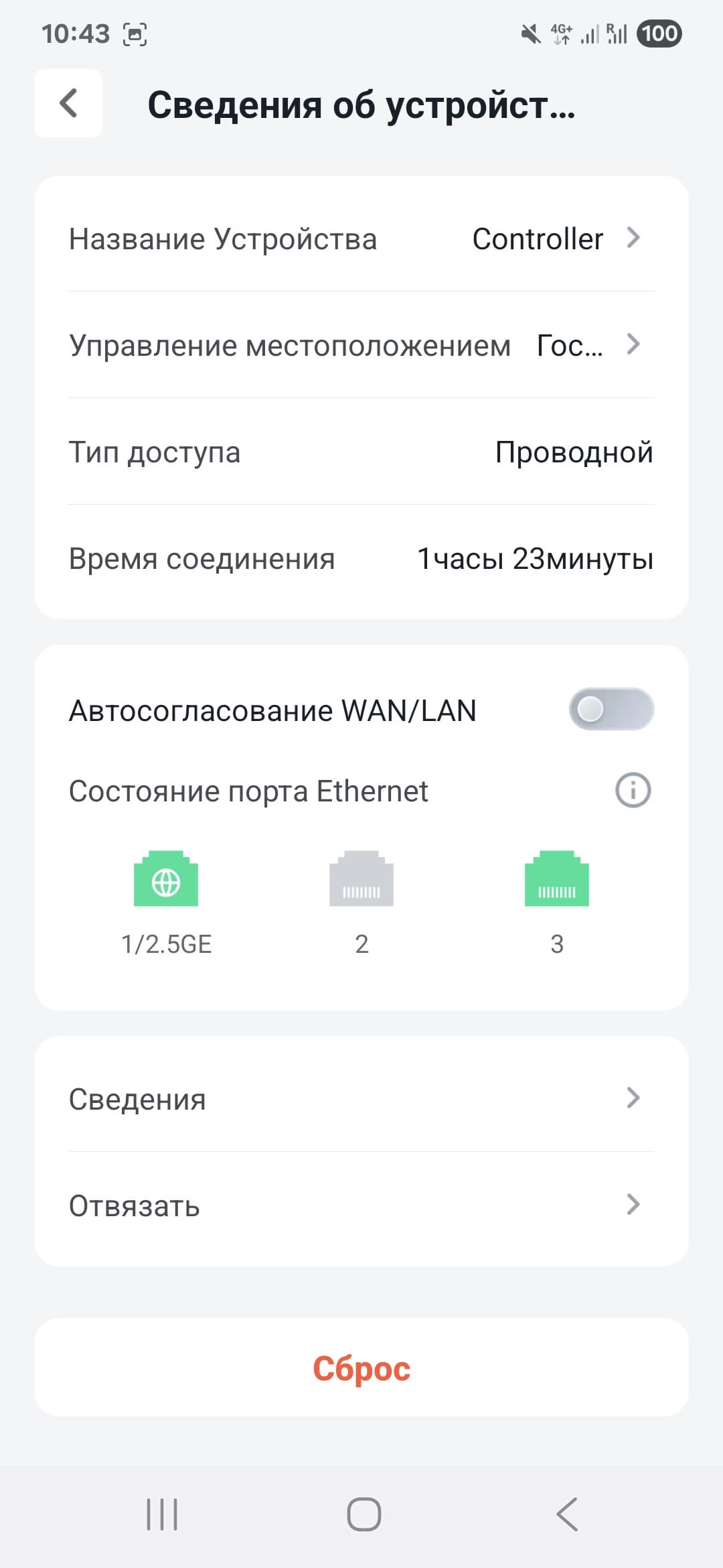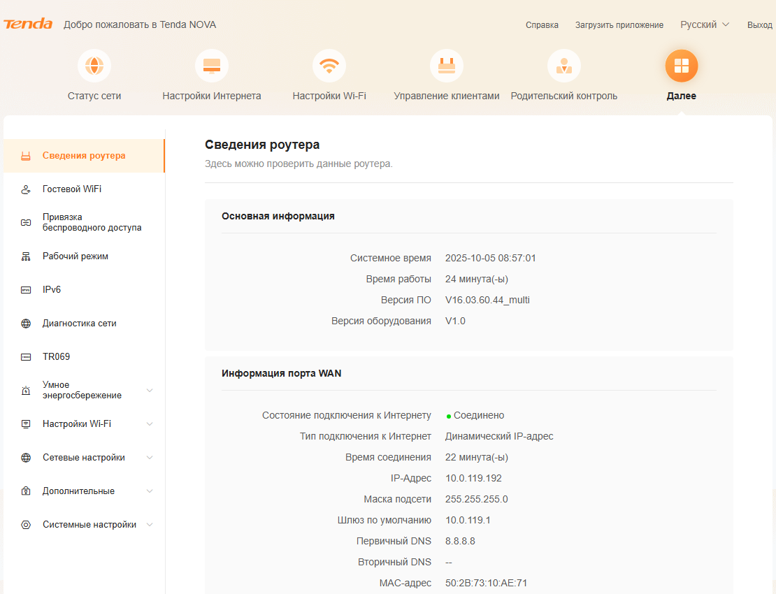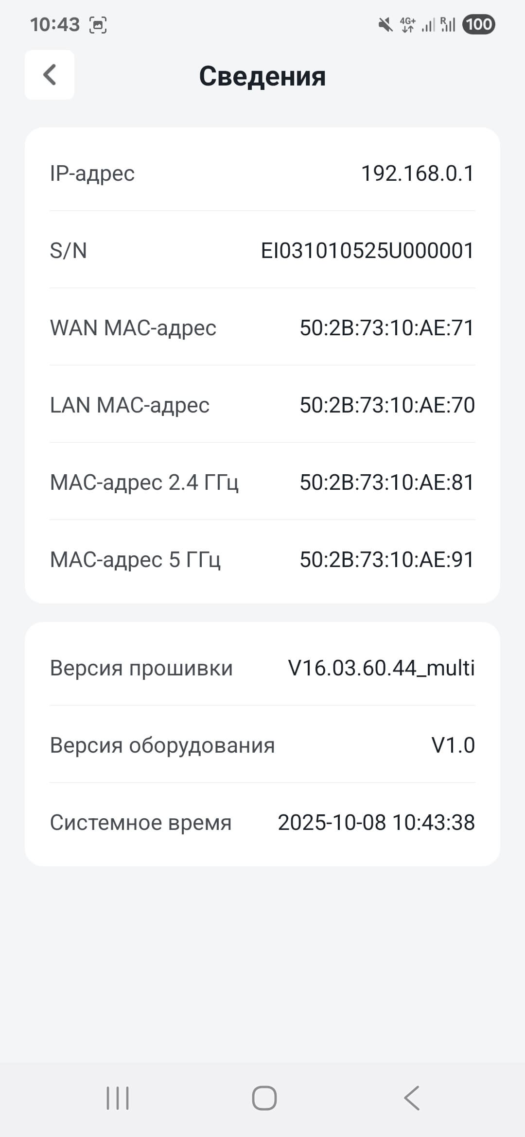 В пункте меню «Далее» находятся еще двенадцать страниц настроек. На первой собраны данные об устройстве, включая информацию по интерфейсам и версию прошивки.