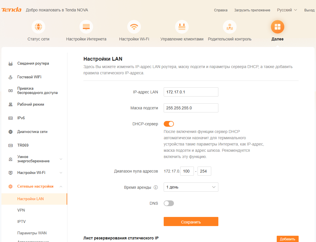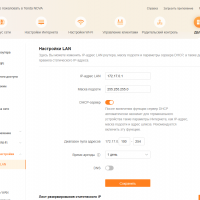 Настройки сегмента локальной сети стандартны: можно выбрать собственный адрес и подсеть, диапазон адресов для клиентов, настроить статические назначения MAC/IP.