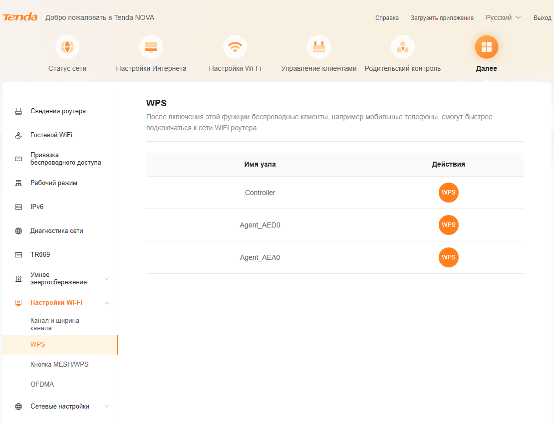 Все узлы системы одинаковы, начать подключение можно с любого. По умолчанию в роли порта WAN используется порт с синей пометкой на 2,5 Гбит/с. Для настройки и управления можно использовать браузер или фирменное мобильное приложение Tenda WiFi. При первом подключении клиента по кабелю в порты 2 или 3 или через открытую Wi-Fi-сеть, имя которой указано на информационной табличке на узле, выбираем тип подключения к провайдеру, имя и пароль Wi-Fi, пароль для доступа к настройкам. Дополнительные узлы автоматически подключаются к основному. Если нужно добавить еще узлов — используется кнопка на корпусе или соответствующий пункт в мобильном приложении. По информации производителя, систему можно расширить до девяти узлов включительно, а каждый узел способен обслуживать до 160 клиентов.