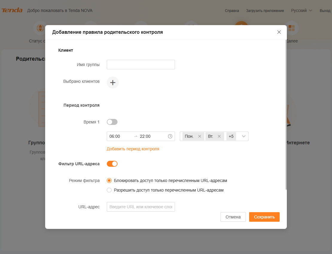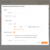 Функция «Родительский контроль» позволяет создать несколько профилей с ограничениями по времени доступа к интернету, а также с белым или черным списком доступных URL и после этого распределить клиентов по ним.