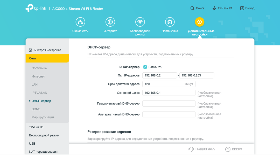 В настройках сегмента локальной сети как обычно есть возможность установить собственный адрес роутера, указать диапазон адресов для выдачи клиентам сервером DHCP, зарезервировать для них фиксированные адреса.