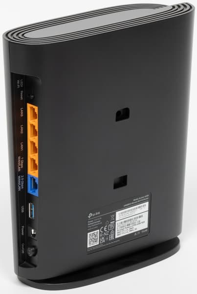 Справа в нише находятся кнопка отключения Wi-Fi и светодиодов, скрытая кнопка сброса настроек, три гигабитных порта LAN, один гигабитный порт LAN/WAN и один порт 2,5 Гбит/с тоже с выбираемым режимом работы LAN или WAN. Порты, к сожалению, без индикаторов, узнать их статус можно через веб-интерфейс. Далее мы видим порт USB 3.0 Type A, вход блока питания и аппаратный выключатель питания.