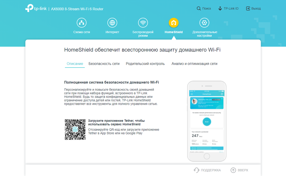 Страницы группы HomeShield содержат только справочную информацию о возможностях данного сервиса. Непосредственно его настройка осуществляется только из мобильного приложения. Напомним, что мы уже писали ранее об этой функции прошивок в статье о модели Archer AX55.