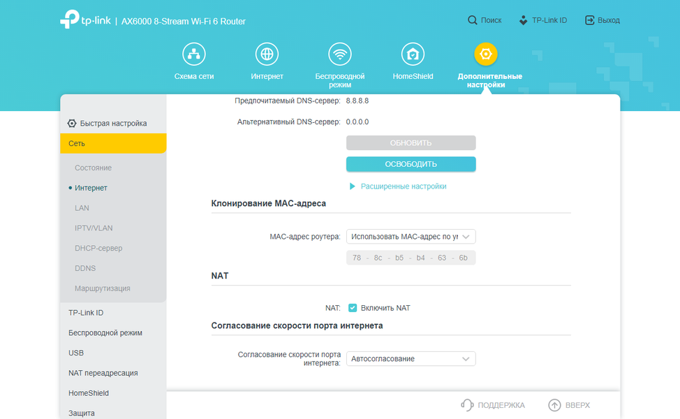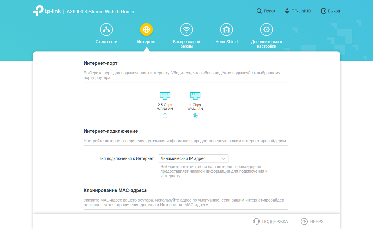 На странице «Интернет» находятся настройки подключения к провайдеру. Можно выбрать используемый порт, режим подключения, изменить MAC-адрес.