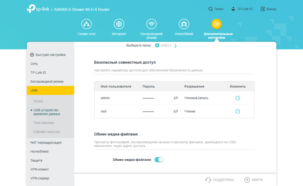 При работе с файлами можно задать двух пользователей — с полным доступом и с доступом только на чтение. Сервер FTP может работать также и со стороны порта WAN с доступом из интернета. Правда, шифрование в нем не поддерживается, так что этот вариант небезопасен.