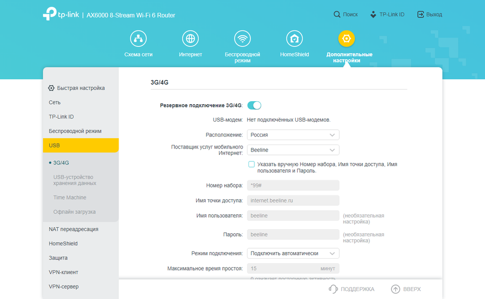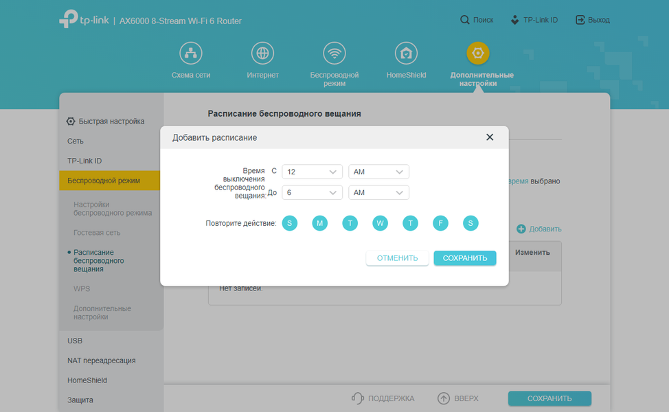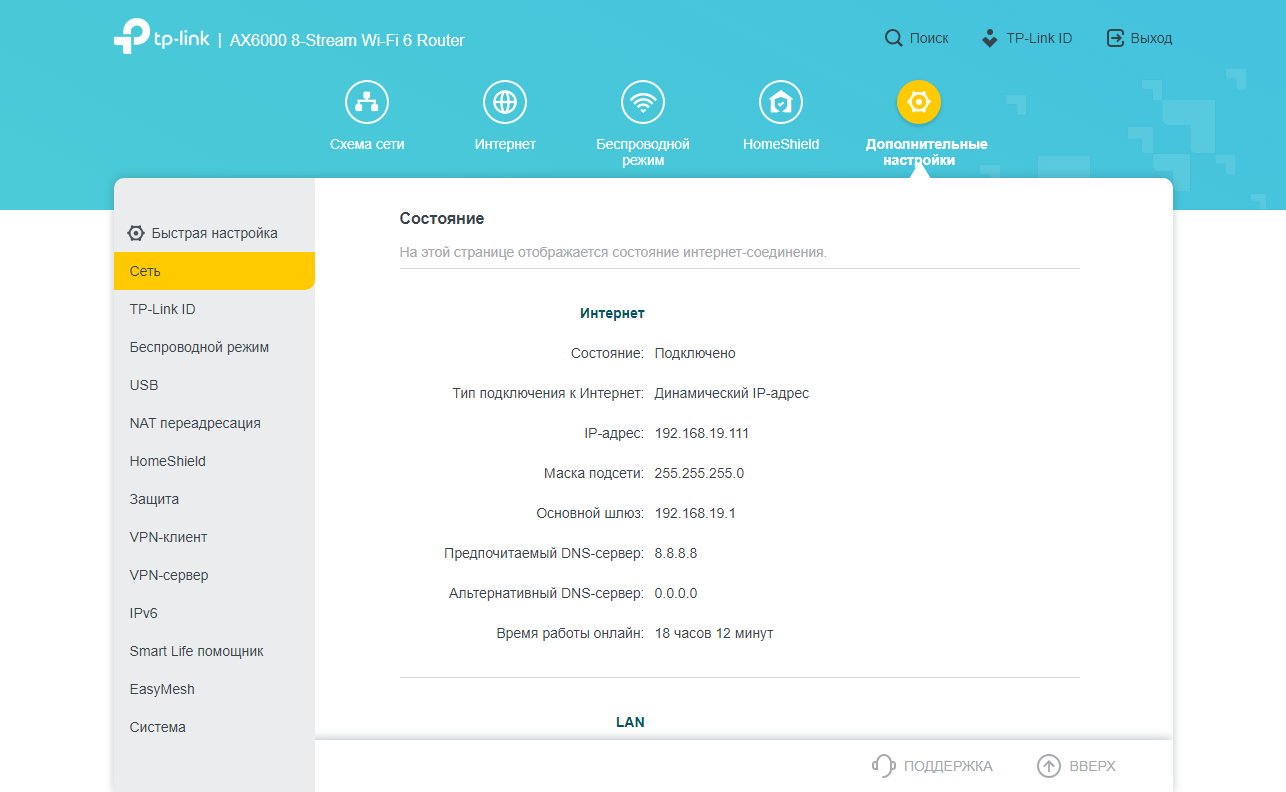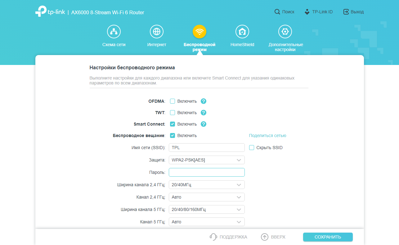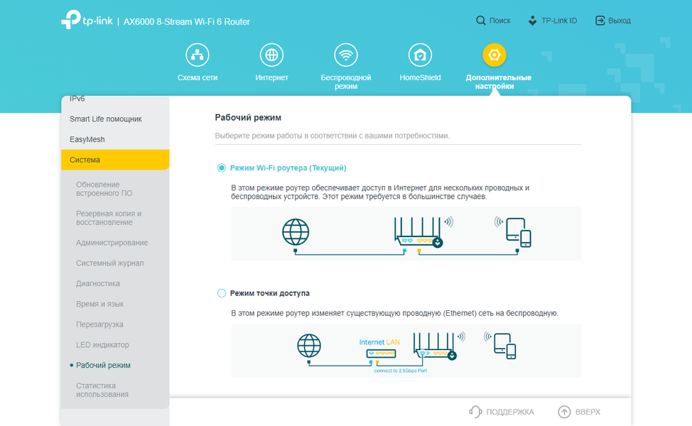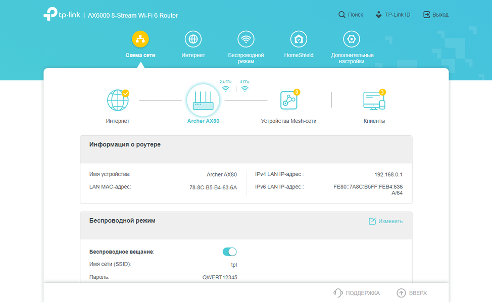 В верхнем уровне меню пять пунктов «Схема сети», «Интернет», «Беспроводной режим», HomeShield и «Дополнительные настройки». Во многих случаях может быть достаточно только двух из них для настройки устройства — второго и третьего.