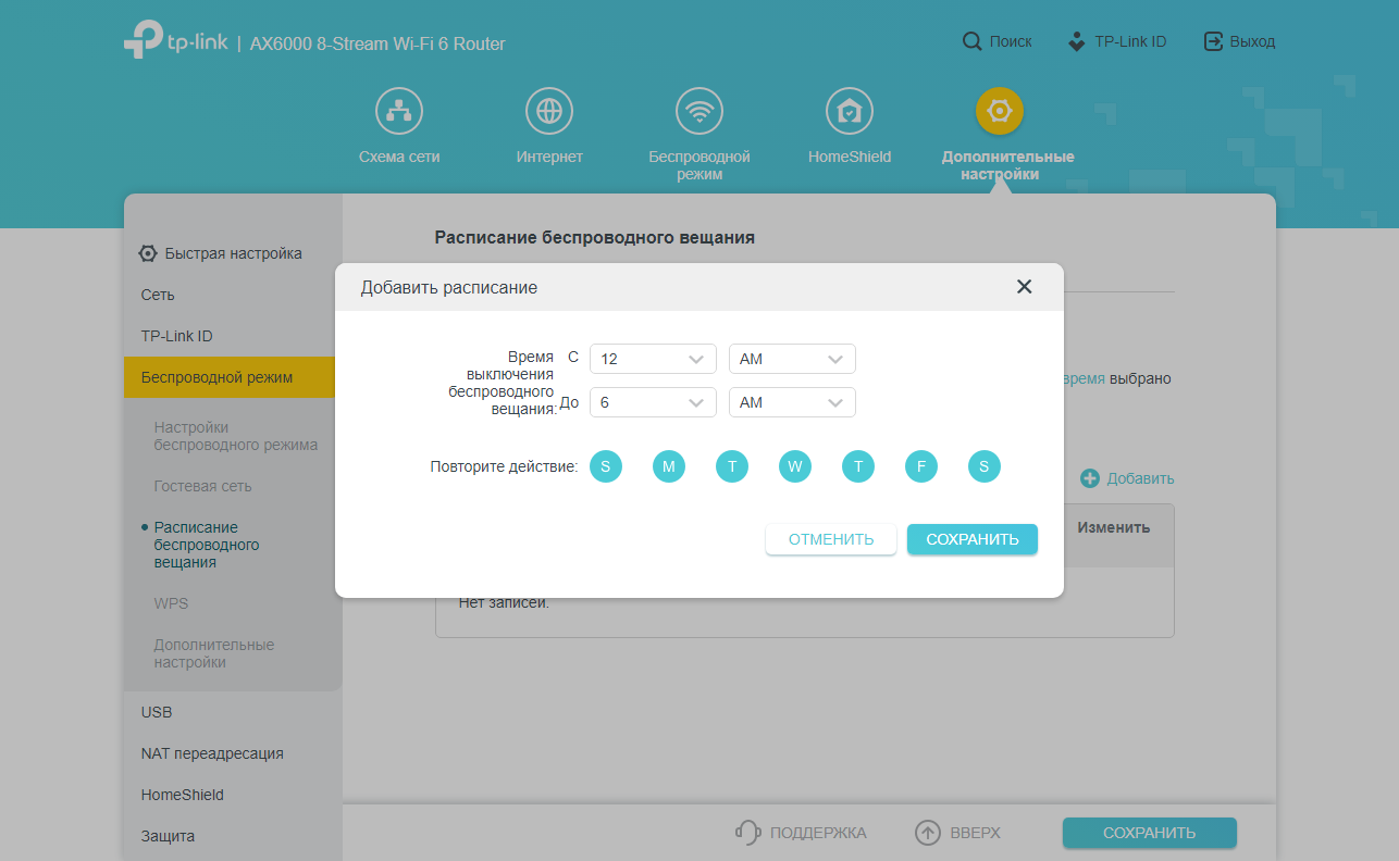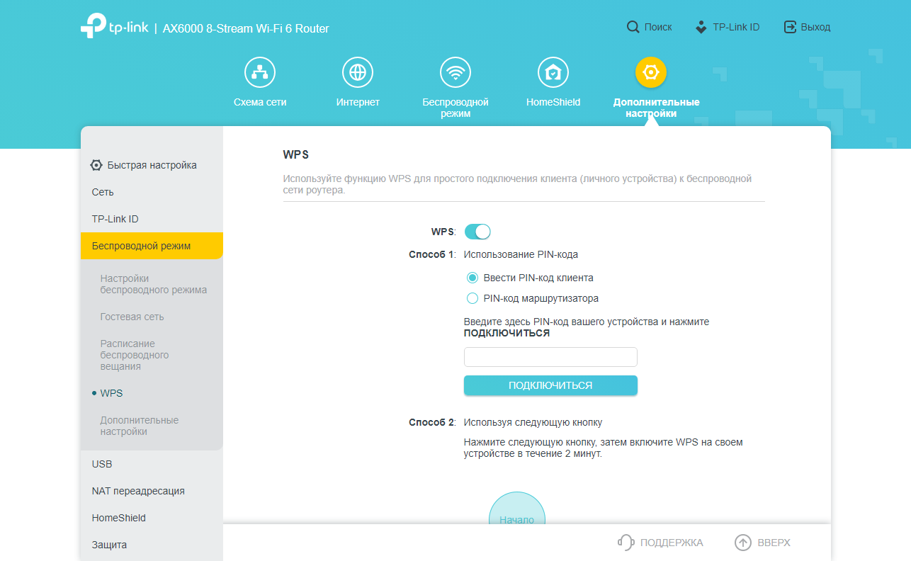 Из расширенных возможностей здесь есть настройка расписания работы Wi-Fi и выбор мощности (три позиции). Для оперативного подключения клиентов к основной сети без ввода сложного пароля можно воспользоваться WPS — c PIN-кодом, виртуальной кнопкой в веб-интерфейсе или физической кнопкой на корпусе роутера.