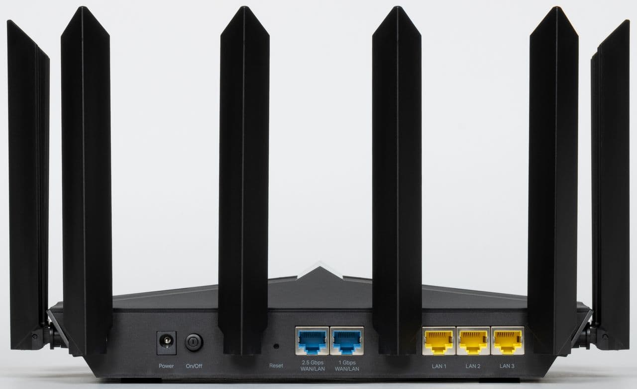 Сзади мы видим вход и выключатель питания, скрытую кнопку сброса настроек, два порта WAN/LAN, из которых один с поддержкой 2,5 Гбит/с, а второй гигабитный, три гигабитных порта LAN. Заметим, что индикаторов состояния/активности портов не предусмотрено.