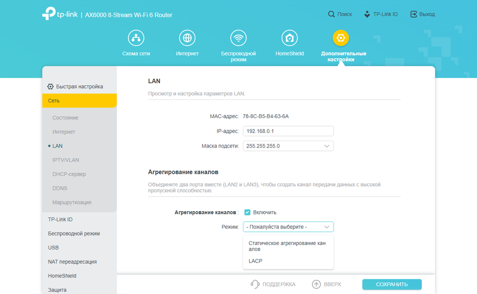 Для локального сегмента сети настройки обычные — выбор собственного адреса роутера и опции сервера DHCP. В частности, можно зафиксировать адреса нужным клиентам. Отметим поддержку режима агрегации проводных портов LAN2 и LAN3, что предоставляет еще один вариант подключения быстрого домашнего сервера к роутеру.