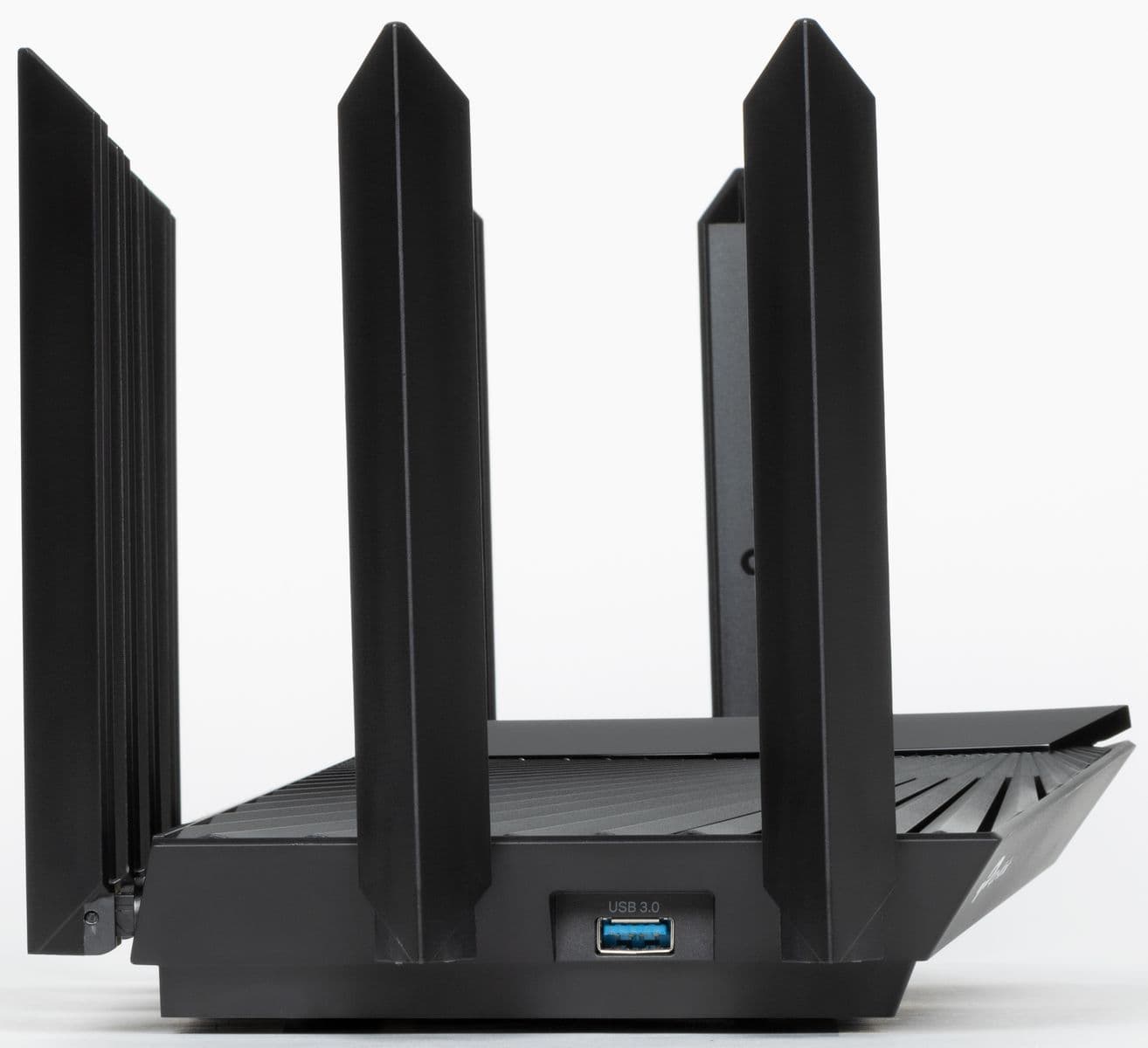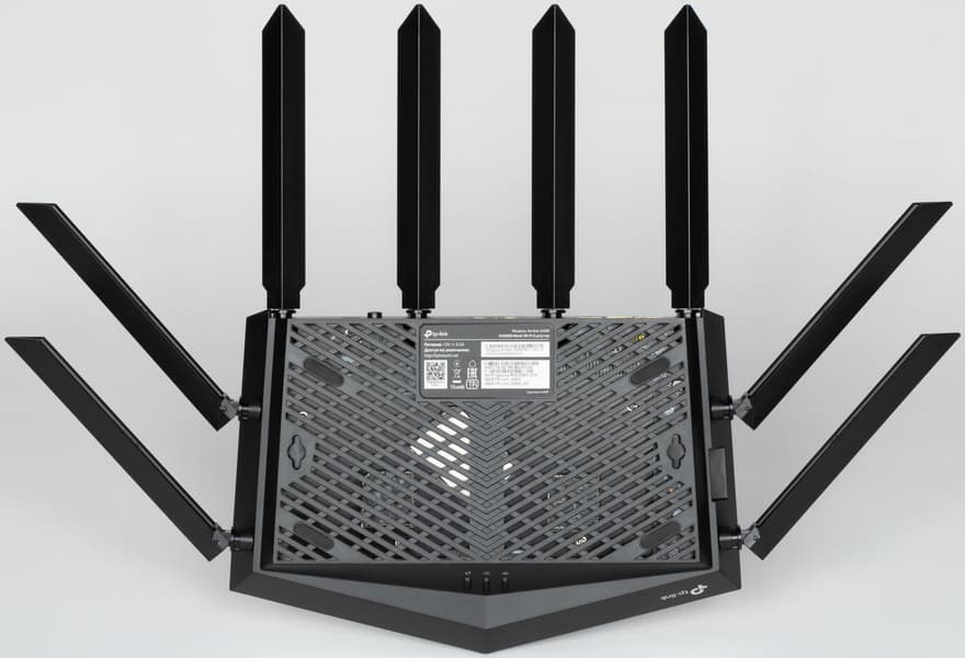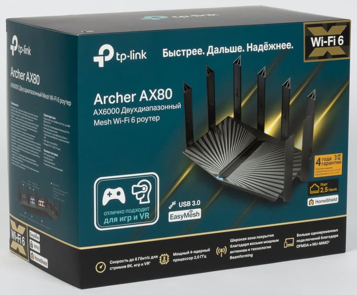 По техническим характеристикам роутер TP-Link Archer AX80 можно смело отнести к верхнему сегменту домашнего беспроводного оборудования. Он имеет поддержку Wi-Fi 6 в двух диапазонах, причем в максимальных конфигурациях: модель имеет класс AX6000, один из проводных портов поддерживает скорость 2,5 Гбит/с, а также есть порт USB 3.0. Кроме того, в устройстве использована мощная четырехъядерная SoC компании MediaTek.