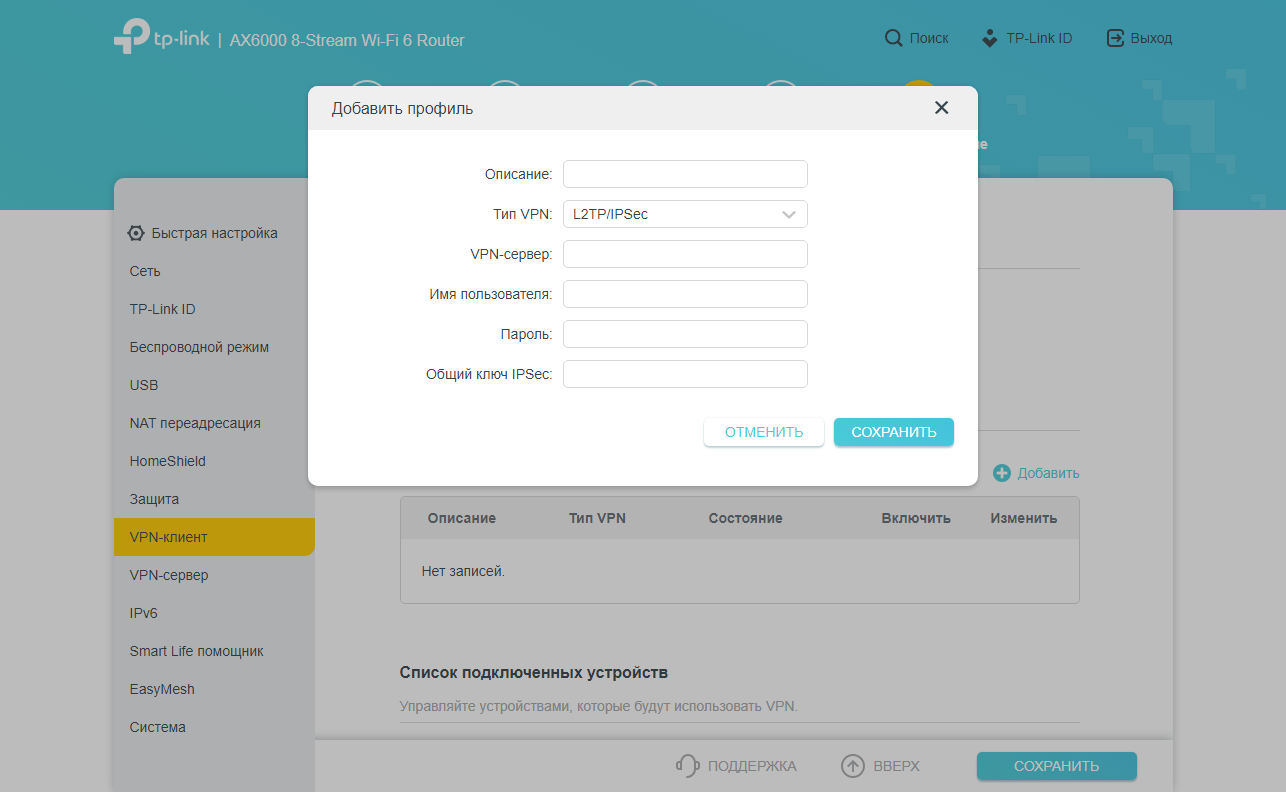В роутере можно настроить клиентов VPN для протоколов OpenVPN, PPTP и L2TP/IPSec и далее выбрать устройства локальной сети, трафик которых в интернет будет отправляться через VPN-соединение.