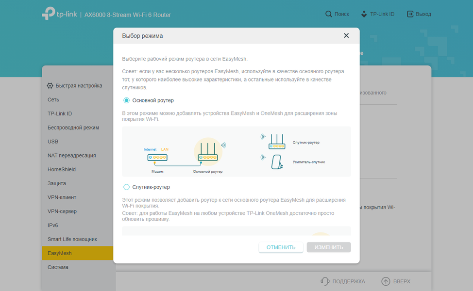 Предпоследним в меню является пункт EasyMesh. В данном случае речь идет о функции Mesh-сети из совместимых устройств для улучшения покрытия и скорости беспроводной сети в больших помещениях. В списке совместимых несколько роутеров и повторителей. Обещан бесшовный роуминг, стабильная работа и простая настройка.