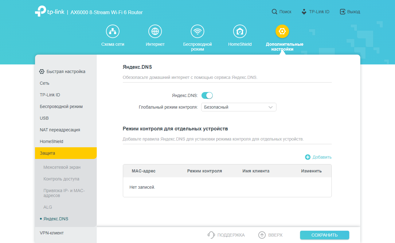 Встроенный межсетевой экран не имеет возможности составления пользовательских правил. В разделе «Защита» также представлены функции контроля доступа к локальной сети по MAC-адресам, привязка MAC—IP, ALG для популярных протоколов. Из дополнительных сервисов отметим поддержку Яндекс.DNS с возможностью привязки профиля к заданным клиентам локальной сети.