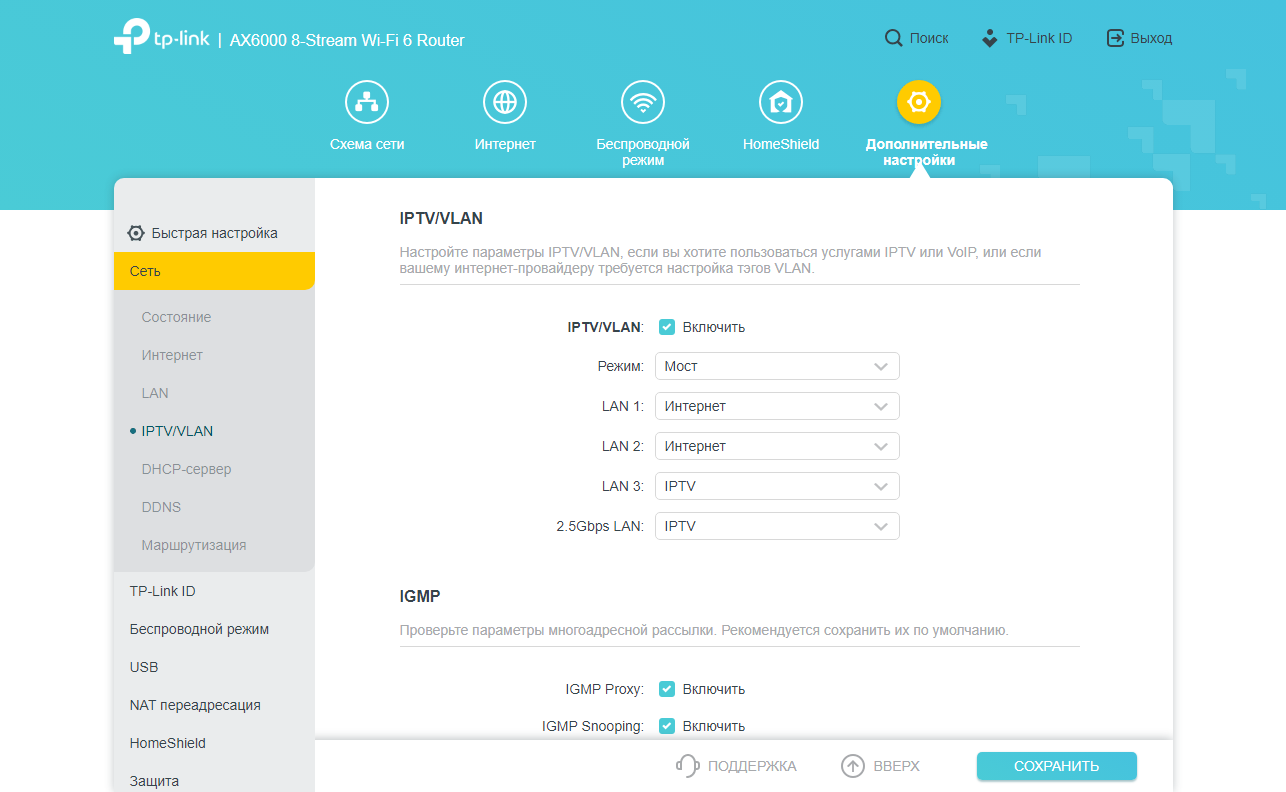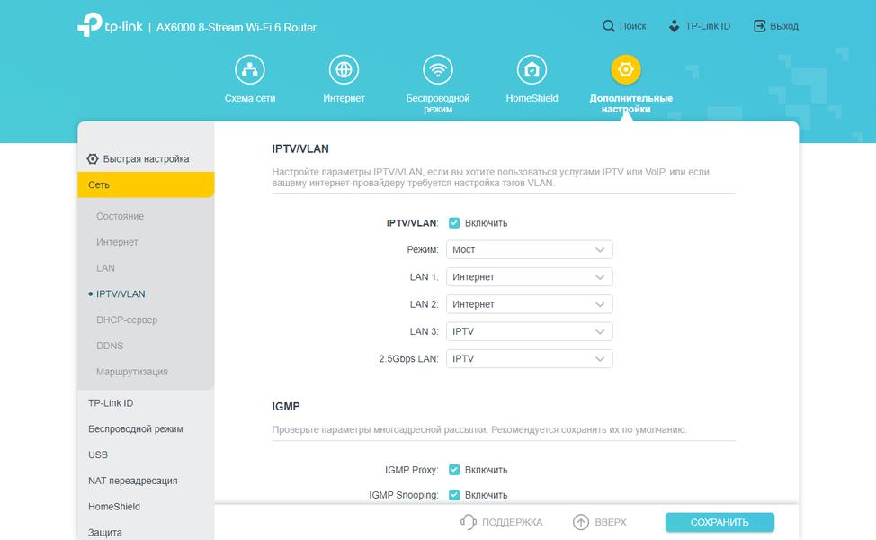 Предусмотрена поддержка IPTV в нескольких вариантах — выделение порта для приставки, мультикаст и UPD-прокси.
