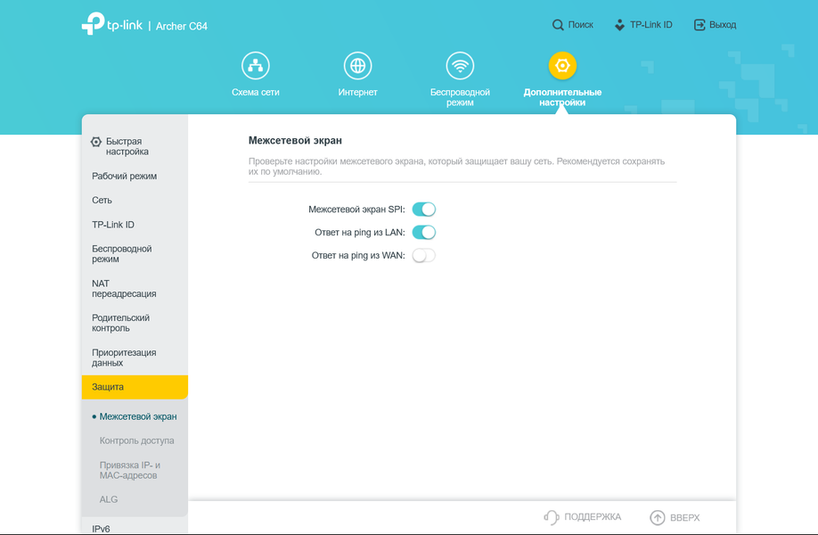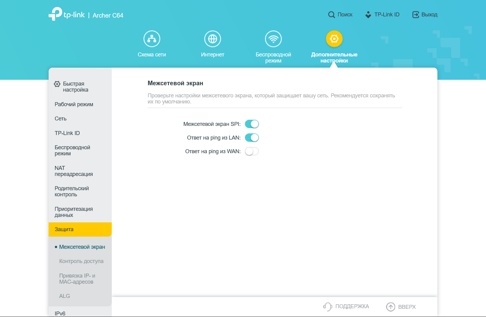 Каких-то особенных настроек межсетевого экрана здесь нет. Можно только выключить его совсем. Также в группе «Защита» есть функция контроля доступа клиентов к сети в виде белого или черного списка.