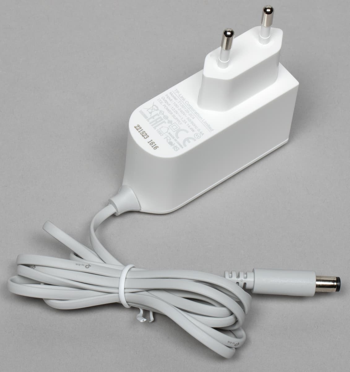 Компактные блоки питания имеют параметры 12 В 1,2 А и мягкий плоский серый кабель длиной 1,5 м, который заканчивается стандартным круглым штекером. Сетевой патч-корд также плоский и серый. Он имеет длину 1,2 м и укороченные разъемы.
