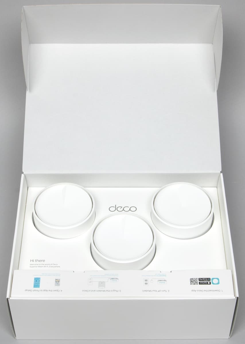 В комплект поставки входят три узла Deco X50, три блока питания для них, один патч-корд и инструкция. Узлы расставлены в достаточно свободном формате в вставке из вспененного пенопропилена.