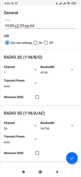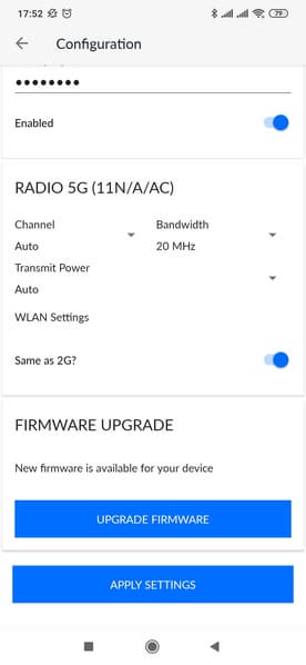 Собственно настройки беспроводных сетей через мобильное приложение минимальные — выбор имени, номера канала, ширины канала, мощности передачи и защиты (здесь можно выбрать WPA2-PSK). Можно использовать одинаковые параметры для имени и защиты для двух диапазонов или же выбрать разные. Для каналов и мощности передачи есть варианты «Авто» или ручной установки. Кроме того, можно изменить имя для точки доступа, отключить светодиод статуса, независимо выключить радиоблоки, обновить прошивку (с загрузкой новой версии через Интернет). В штатном режиме работы индикатор горит синим. В документации приводится описание и других статусов (например, мигание синим — обновление прошивки).