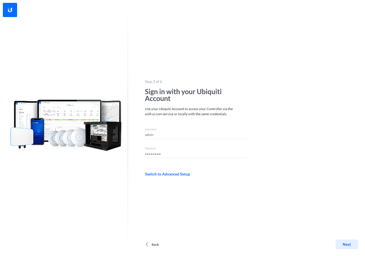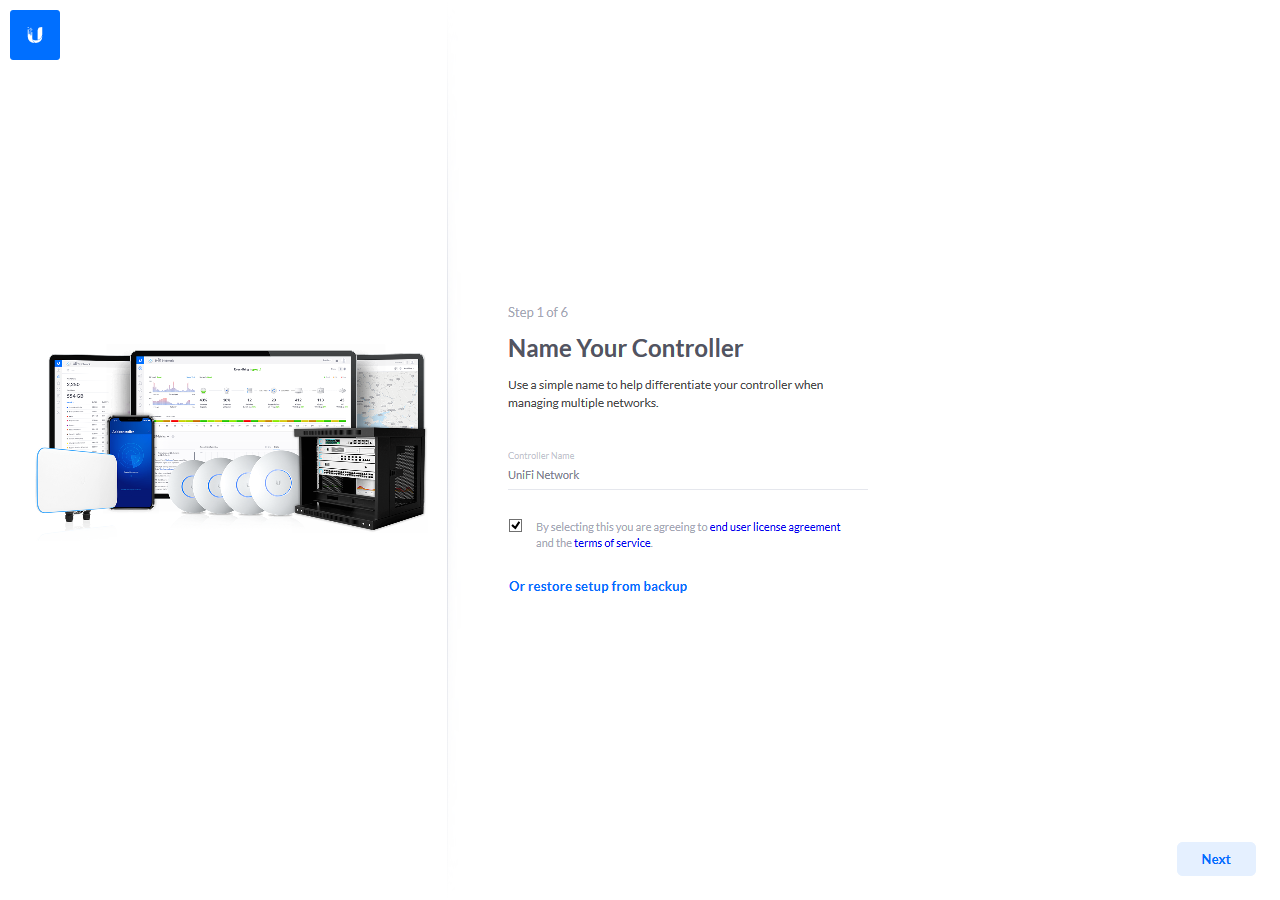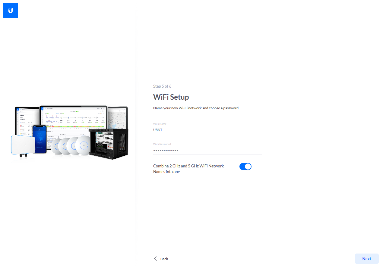 Всего в нем предусмотрено шесть шагов: выбор имени контроллера, вход в аккаунт Ubiquiti, галочки для автоматической настройки основных параметров беспроводных сетей и включения резервного копирования конфигурации по расписанию, добавление устройств, указание имени и пароля для беспроводной сети, выбор региона и часового пояса.