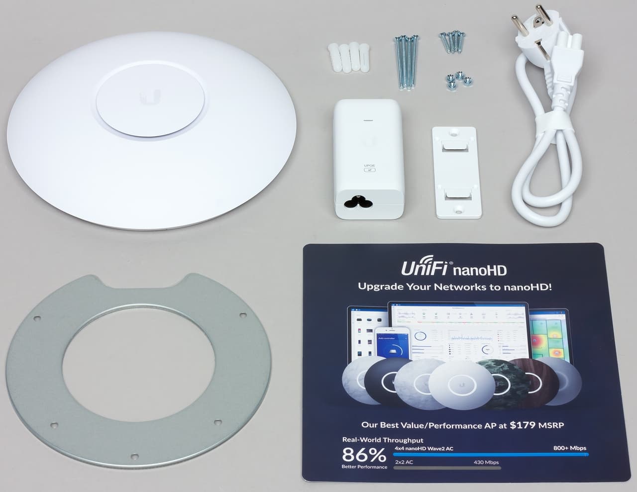 В комплект точки доступа входит инжектор PoE (модель U-POE-af) с пластиной крепления и сетевым кабелем длинной около 60 см, комплект крепления на стену или потолок, краткая документация. Заметим, что для минимальной проверки работы устройства потребуются два сетевых патч-корда (или один, если у вас есть коммутатор с PoE).