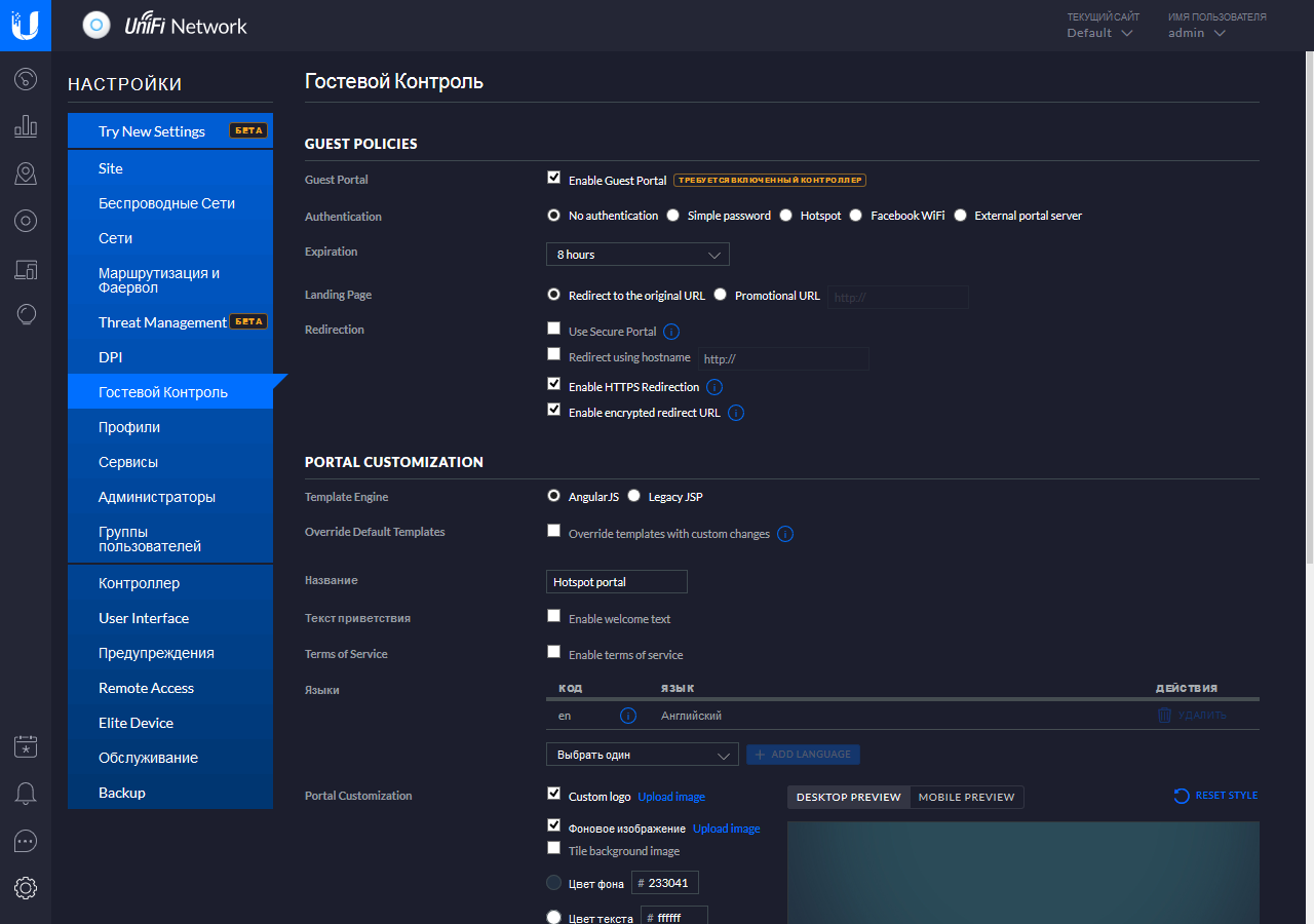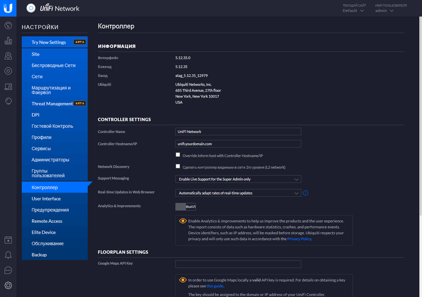 Остальные пункты преимущественно относятся к контроллеру целиком. В частности можно запрограммировать дополнительные аккаунты администраторов, установить название и имя хоста контроллера, настроить внешний вид Web-интерфейса, настроить систему уведомлений по типам событий и каналам связи, разрешить удаленный доступ через портал UniFi, настроить интервалы хранения статистики и событий, включить автоматическое создание резервных копий контроллера.