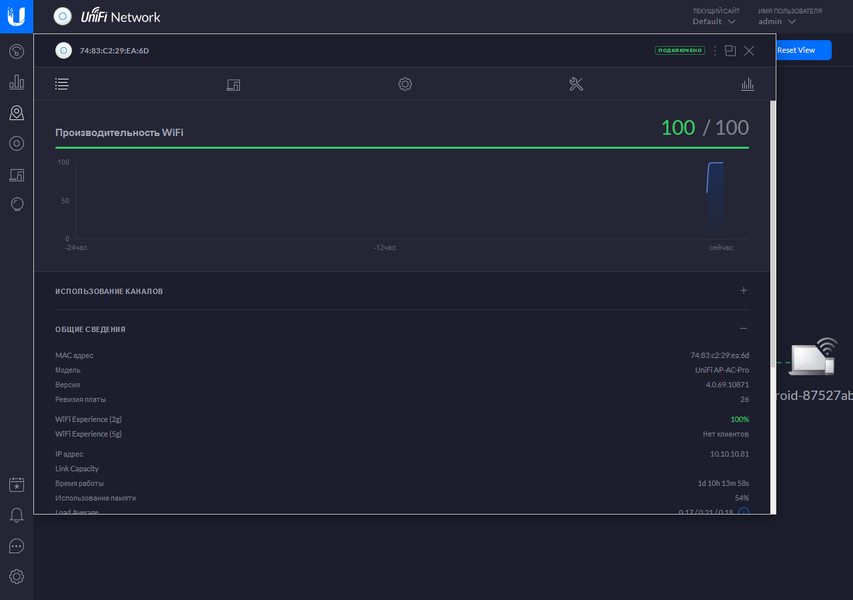 В сети не использовался USG и оценить работу на протяжении длительного времени можно было благодаря интеграции с системой мониторинга Zabbix. Она собирала данные как с контроллера, так и с портов коммутаторов, на которые были подключены точки доступа. Максимальная нагрузка по числу клиентов в сети составляла до 90 одновременных подключений суммарно по всем точкам доступа. Если же смотреть на каждую точку отдельно, то в логах можно найти значения в 25 клиентов. Благодаря размещению наиболее мощных моделей в самых требовательных местах, к скорости сетевого подключения редко возникали замечания. Время от времени проводились тестовые измерения скорости и они обычно показывали максимальные для клиентов значения (например, около 200 Мбит/с для смартфона с одной антенной и поддержкой 802.11ac). Статистика также показала, что в реальной работе мало кому требуется максимальная скорость на длительный период.