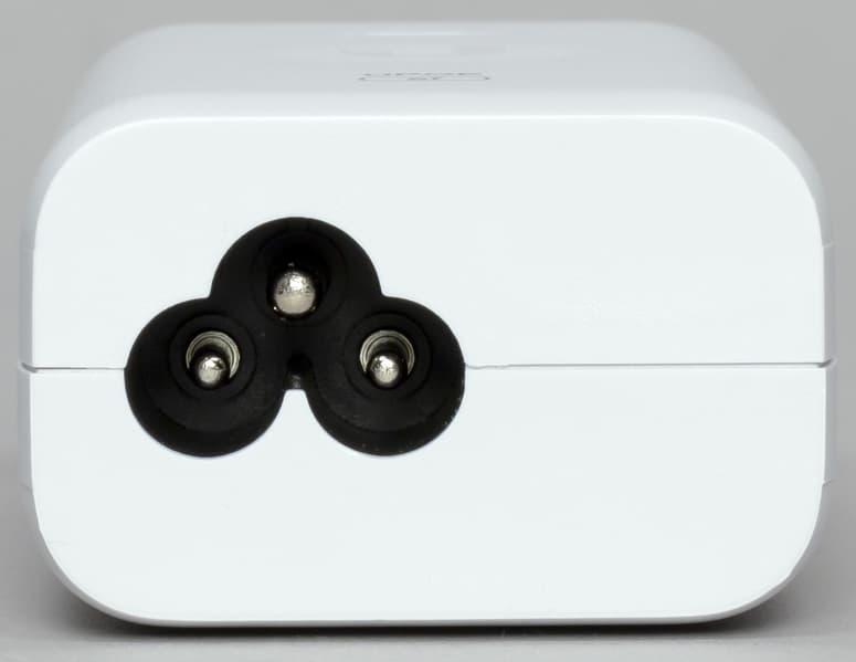Инжектор имеет компактный (всего 81×46×31 мм) корпус из матового белого пластика. На одном из торцов находится вход кабеля питания по стандарту C6 (такой часто бывает у блоков питания ноутбуков), а на противоположном — два сетевых разъема без индикаторов.