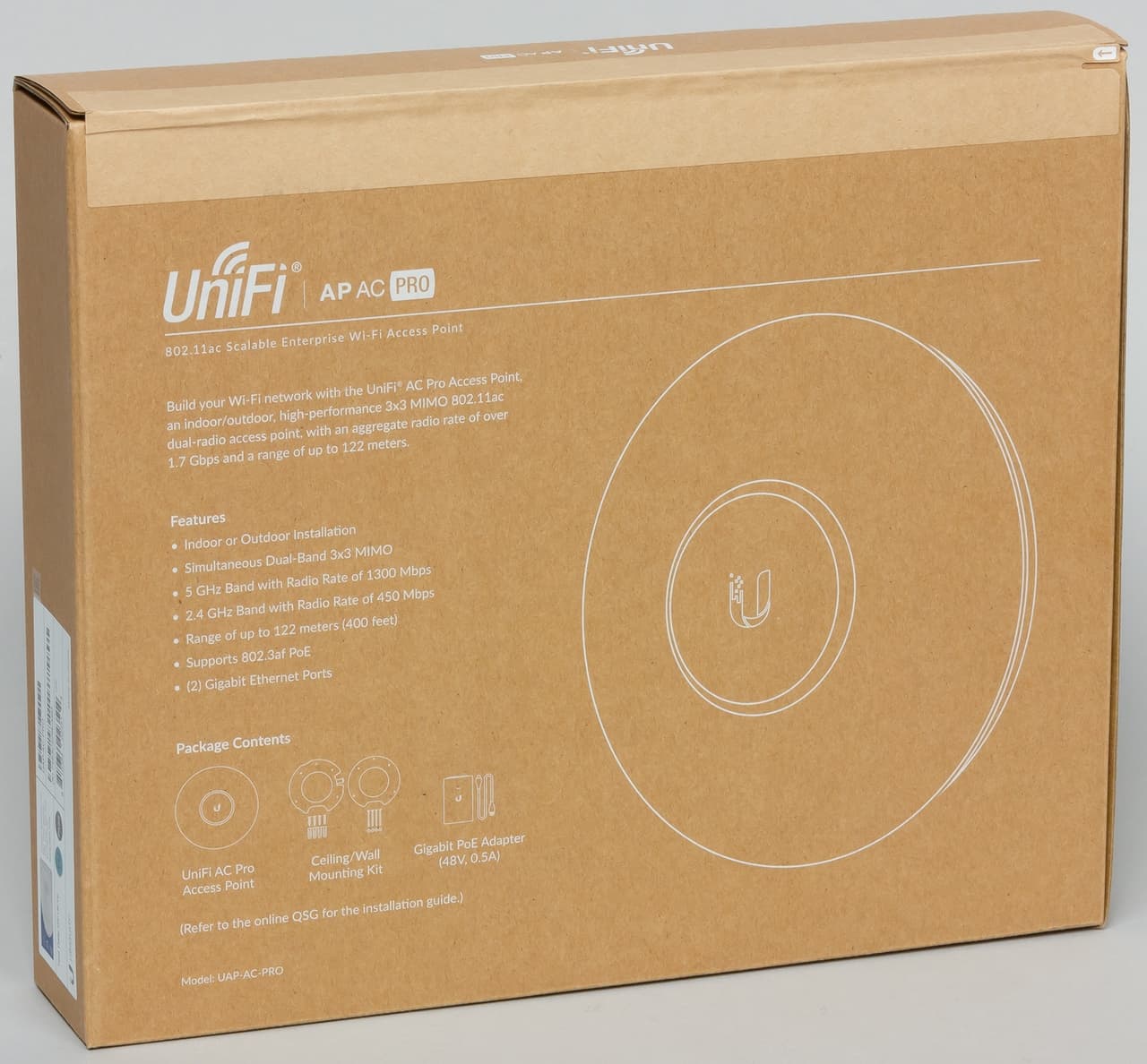 В семействе точек доступа UniFi с поддержкой протокола 802.11ac рассматриваемая модель является одной из тех, что предоставляют максимальные скорости. Она использует три внутренних двухдиапазонных антенны и обеспечивает скорости соединения до 450 Мбит/с в диапазоне 2,4 ГГц с протоколом 802.11n и до 1300 Мбит/с в диапазоне 5 ГГц с протоколом 802.11ac.