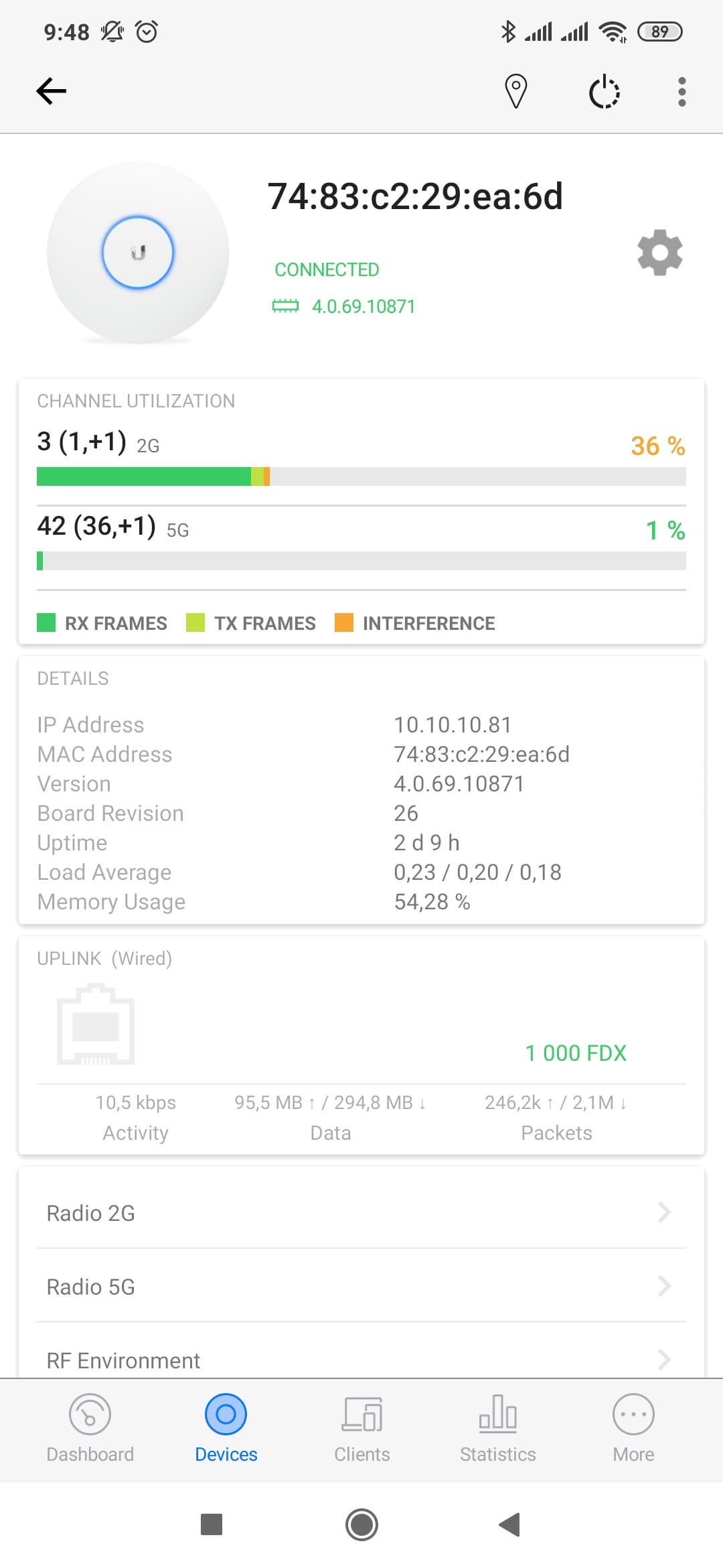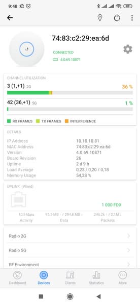 На странице «Devices» представлены все точки доступа данного сайта. Для них можно посмотреть текущее состояние и результаты сканирования эфира. Доступно и большинство настроек из Web-версии, включая управление беспроводными сетями и радиоблоками.