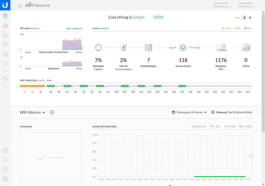 На стартовом экране отображается общая информация о сети, включая управляемые устройства и клиенты, нагрузка на каналы Wi-Fi и некоторые метрики. Как мы говорили ранее, часть функций контроллера работают только при использовании и фирменного шлюза Ubiquiti.
