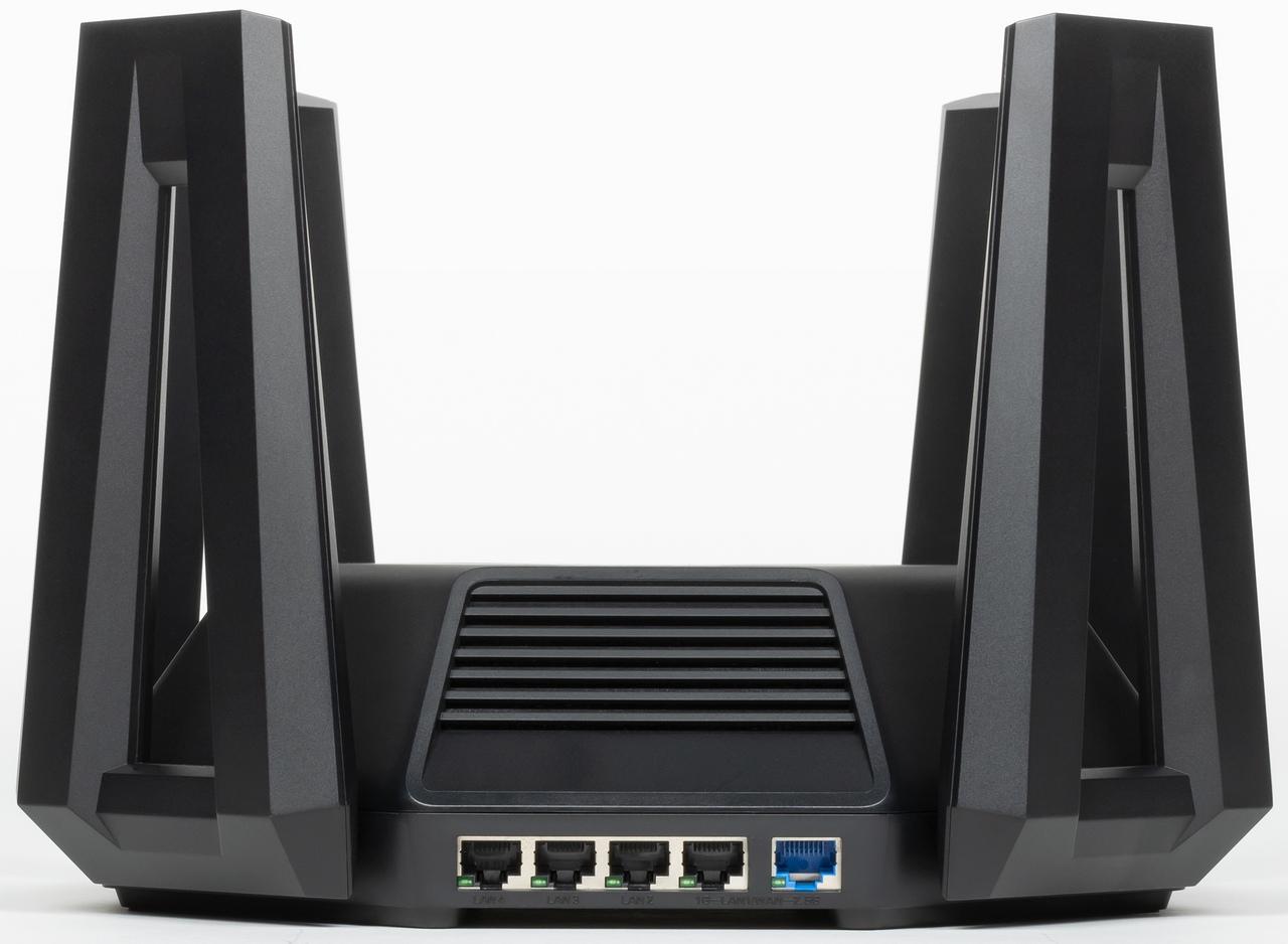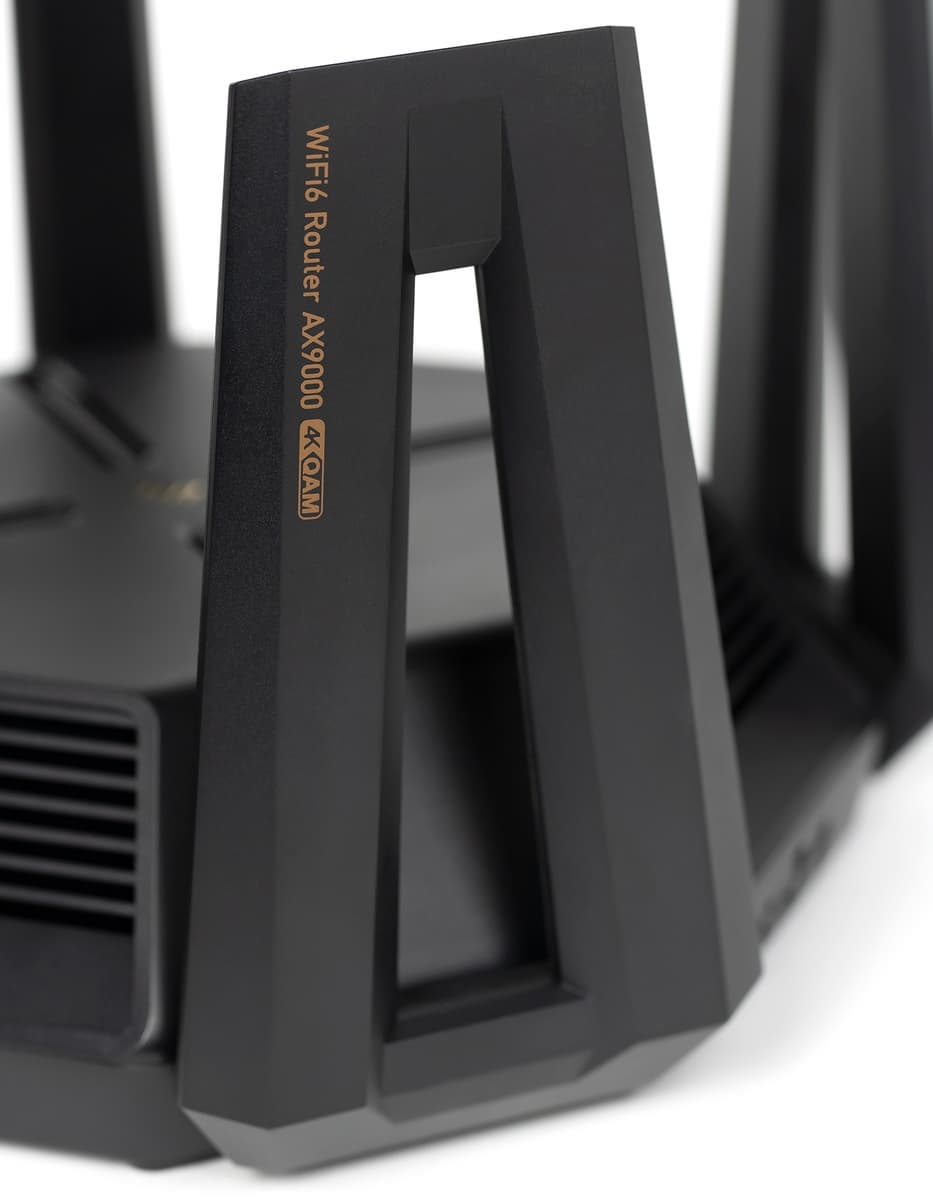 Все три радиомодуля работают на базе отдельных микросхем и в конфигурации 4×4. В каждой из четырех антенн установлено по три плоских антенны для каждого из «трех» диапазонов. При этом для модуля на 2,4 ГГц (чип QCN5024) максимальная скорость подключения составляет 1148 Мбит/с (с 802.11ax и каналом 40 МГц), для первого модуля 5 ГГц (чип QCN9024) с поддержкой каналов 36—64 — 4804 Мбит/с (802.11ax, канал 160 МГц), для второго модуля 5 ГГц (чип QCN5054) с поддержкой каналов 149—165 — 2402 Мбит/с (802.11ax, канал 80 МГц). Все основные радиомодули используют усилители FEM. Итого частотная формула 1148+2402+4804=8354 немного недотягивает до заявленных AX9000. Недостающие 433 Мбит/с обеспечиваются выделенным беспроводным модулем AIoT (чип QCA9889), который имеет одну антенну и поддержку 802.11ac. Сама антенна в данном случае встроенная и находится в области фронтальных индикаторов.
