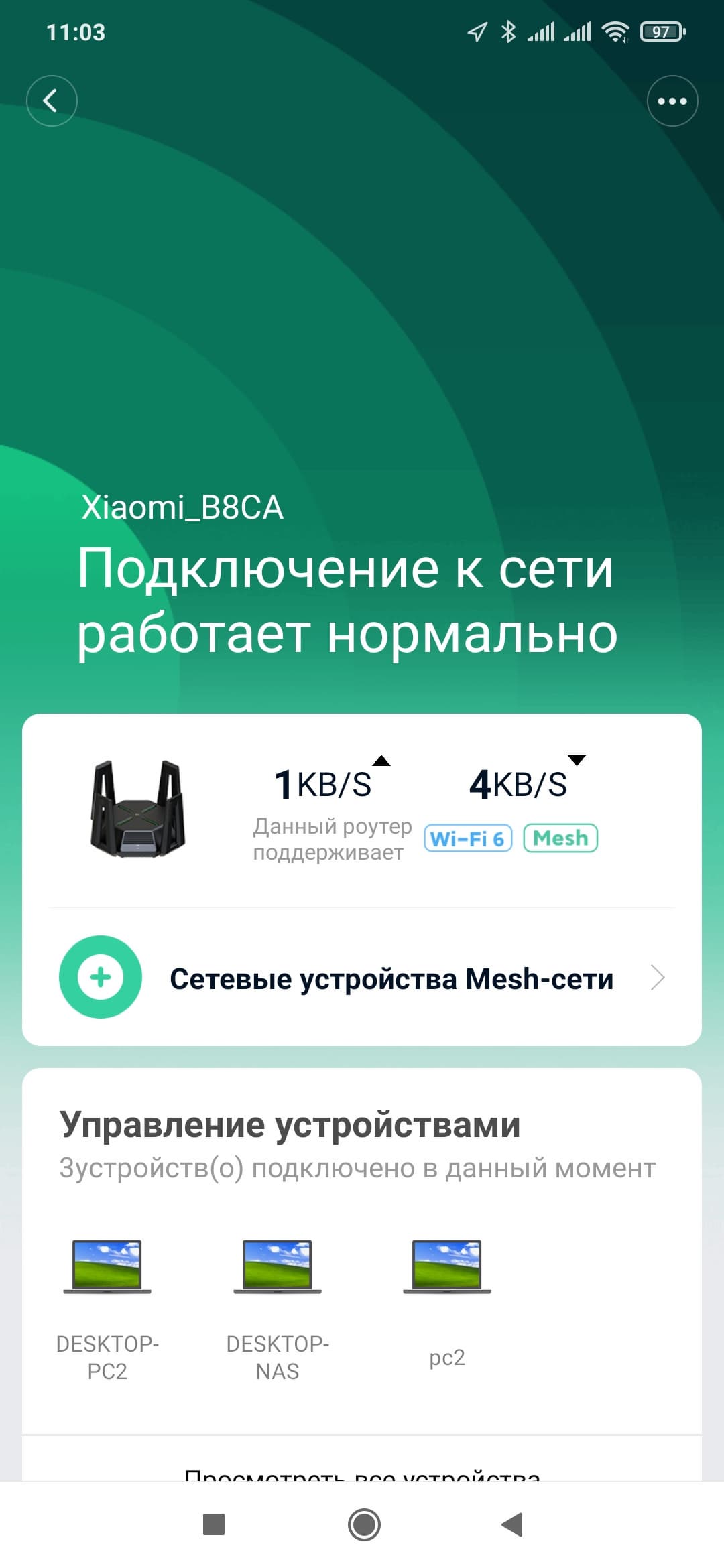 На главном экране Mi WiFi в верхней части мы видим текущие скорости приема и передачи данных роутером и общий статус состояния сети. Ниже идет пункт для настройки Mesh-системы и за ним список подключенных клиентов.