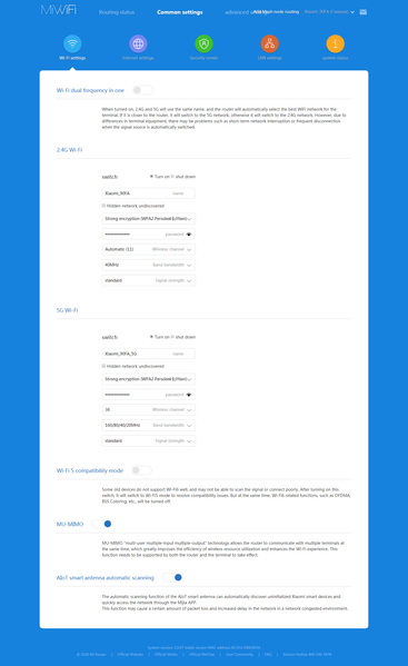Основное меню общих настроек начинается со страницы с параметрами Wi-Fi. Здесь можно установить имена и пароли сетей, номера (для диапазона 5 ГГц поддерживаются 36—64 и 149—165) и ширину канала, мощность радиопередатчика, скрыть трансляцию имен, включить режим общего для двух диапазонов имени, отключить MU-MIMO и сервис AIoT.