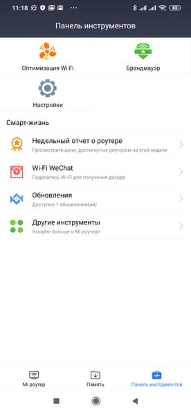 Модель не имеет порта USB или встроенного накопителя, так что пункт «Память» здесь недоступен. Все настройки роутера находятся в разделе «Панель инструментов». В верхней части три кнопки — «Оптимизация Wi-Fi», «Брандмауэр» и «Настройки». Ниже находятся пункты группы «Смарт-жизнь».